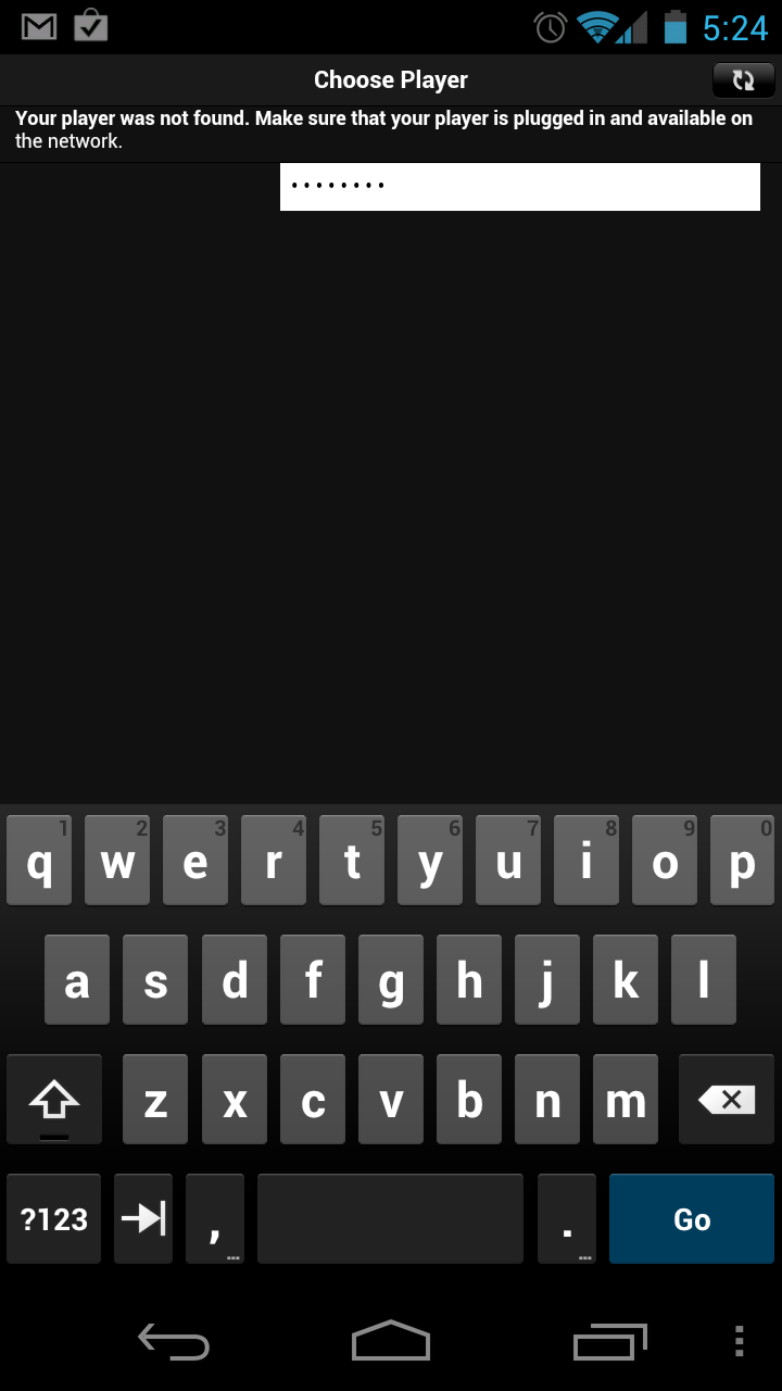 Logitech Squeezebox Controller 1.1.2 on Android 4.0.1. The Android virtual keyboard features a "Go" button. When the app is initially installed, you are prompted for your Squeeze Network username and password. After entering your details, if you click the "log in" button in the app, things works as expected. However, if you click the "Go" button in the virtual keyboard, things do not. You login details are accepted and it's possible to control players that are connected to Squeeze Network. However, devices on the local network are not detected.