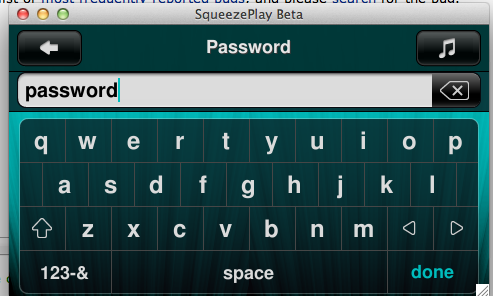 Created attachment 7606 [details] This is the screen where it get stuck on. The Done button doesn't work My music is password protected according to the standard way of working. My duet and 3 squeezeboxes work fine with the password. But I am not able to complete the password in the interface of squeeze play. Steps. First squeeze play asks for user: Define the user click Done Then squeeze play asks for password: Define the password, click on Done, but nothing happens. The screen with the password filled in is still in front of me.