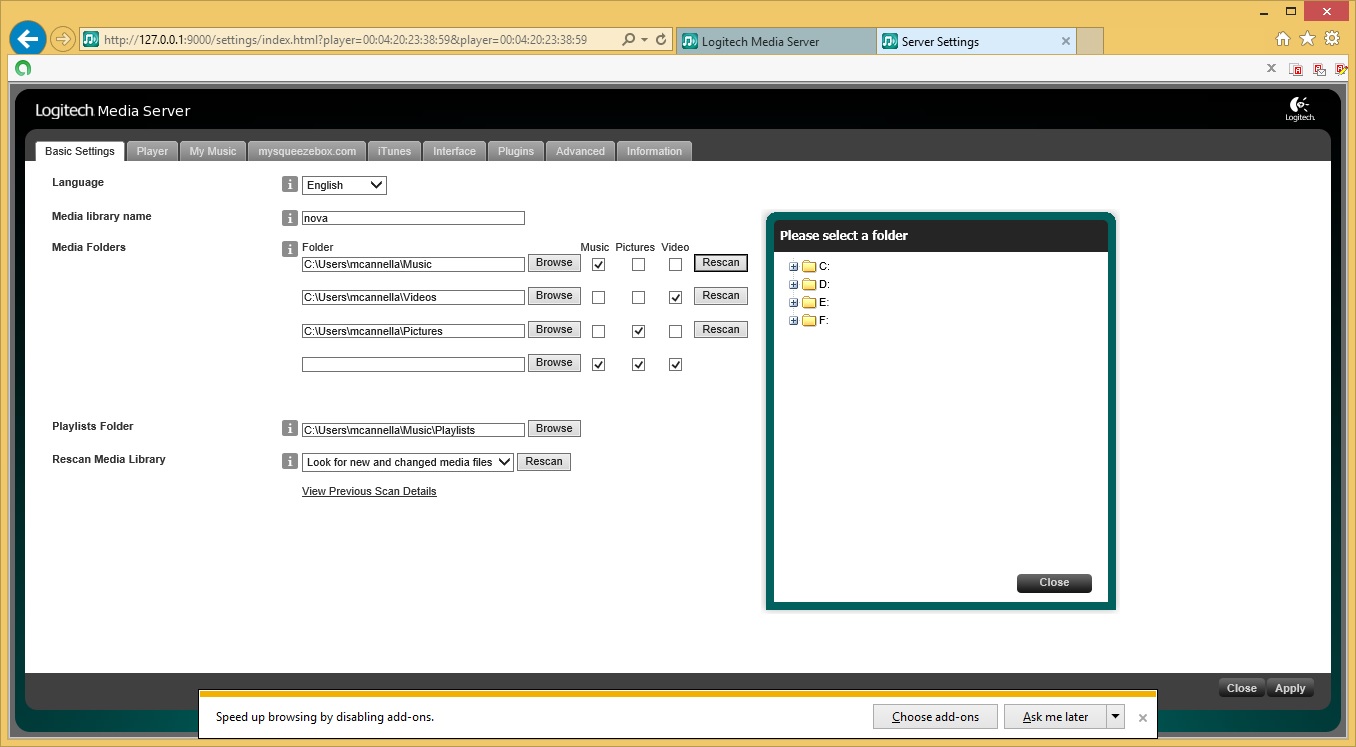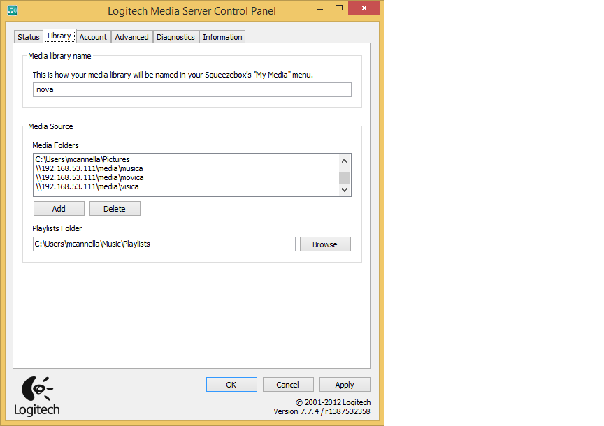 Logitech Media Server Version: 7.7.4 - 1387532358 @ Wed Feb 5 02:05:00 CUT 2014 OS: Windows 8.1 Setup notes: - running LMS as an unpriviliged service user, svc_logitech - media library is a guest-visible read-only SMB share at \\theserver\media\music - service account user can read media files on the share in an interactive login session - I ran this setup fine on 7.7.3/XP and 7.7.3/win8.0. I tried to move the LMS to an OSX Mavericks machine with disastrous result, and upon coming back to the windows box (now upgraded to 8), i installed 7.7.4 Issue: Can't get network path configured as a media folder 1. Web interface cannot add network shares: The browse box only shows local drives (physical and iscsi mounts), and when I type "\\" paths or network-mounted drive letters in the field and hit "apply" the field is cleared. 2. Control panel appears to allow the paths to be added, but it does not really work: I can add the path and hit apply, but if I force a rescan, only the local paths are searched, and if i exit and reopen the panel, the paths are gone.