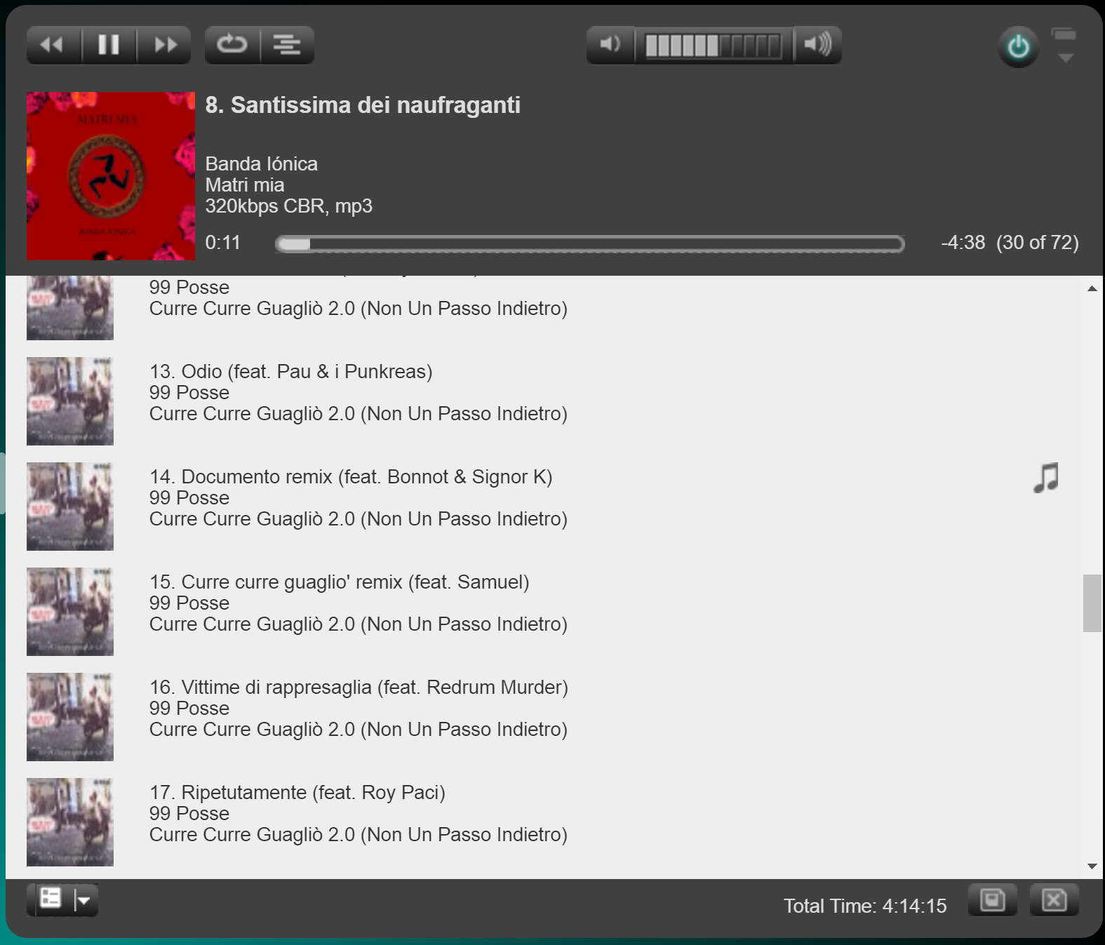 Other peculiarities... (1) When the second album was almost done playing, the "now playing" indicator disappeared off the end two tracks early; adding a new album to the playlist made it reappear on the first few tracks of the newly added album. (2) pausing playback (using the || button) and restarting (using the |> button on an individual track) caused the "now playing" indicator to display correctly on the currently playing track, but as soon as that track finished it jumped back to being 2 tracks ahead. (3) deleting tracks from the playlist (using the X button) delete tracks _above_ the track clicked. (4) letting the playlist run to the end, and then selecting a new album to play (replacing the old playlist) seems to be back in sync.