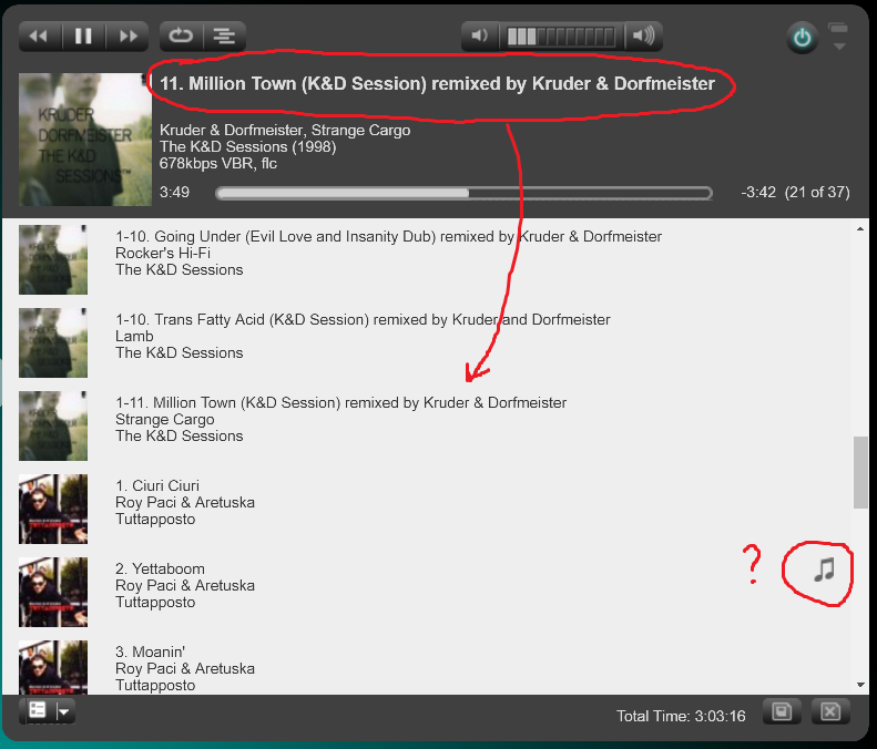 Created attachment 7747 [details] Player shows current playing tune; playlist indicates a different tune is playing LMS details ----------- Logitech Media Server Version: 7.9.0 - 1464511112 @ Sun May 29 08:47:53 CUT 2016 Hostname: Yoga IP: 192.168.1.11 HTTP Port: 9000 OS: Windows 8.1 - EN - cp1252 Platform: 8664 Perl Version: 5.14.1 - MSWin32-x86-multi-thread Audio::Scan: 0.95 Database Version: DBD::SQLite 1.34_01 (sqlite 3.7.7.1) Total Players Recognized: 1 Problem details --------------- WebUI Playlist out of sync with Player (see attached screenshot). Player widget shows currently playing tune; playlist shows that a different tune is playing (and seems be missing some tracks from first album. In the attaached screenshot, the player widget correctly shows the playing tune but the playlist indicates that a different song is playing. Also, the playlist count says "track 30 of 72" but there are only 53 items in the playlist. Steps to reproduce ------------------ It seems to me that the problem arises when appending albums to an existing playlist (eg. "play album" followed by "append album to playlist". The top part of the first album disappears from the playlist (perhaps tracks that were already played at the point where the second album is appended?) and thus the currently-playing track number is further down the playlist than it should be. I first noticed it last week, and it's continued through the latest nightly update. I believe LMS used to break long playlists into pages until recently, and I don't see it doing so at the moment (though it may be due to me fiddling with the settings); is this related?
