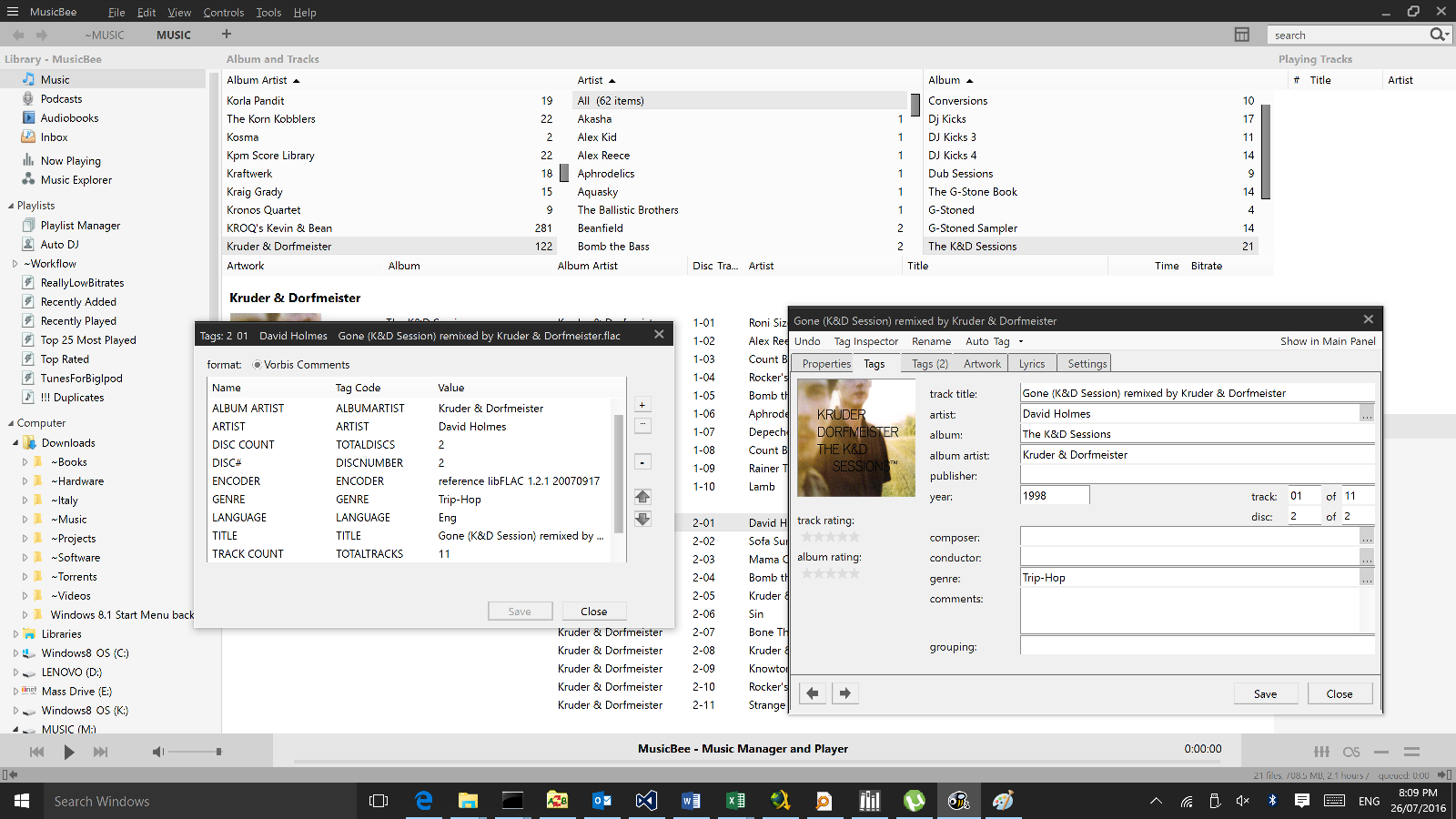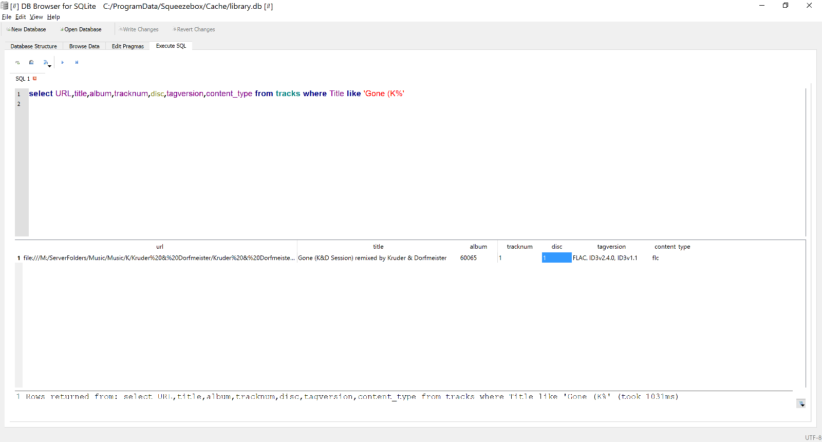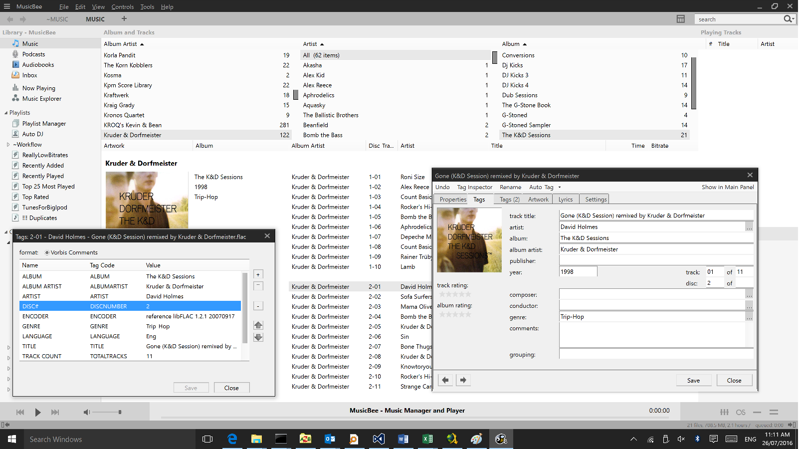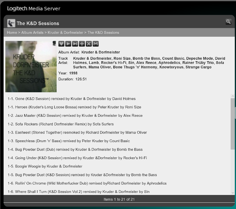 I have both discs of this release in the library, and the problem happens on other multi-disc FLAC sets. 'View Tags' in the LMS webUI gives the following: ALBUM: The K&D Sessions ALBUMARTIST: Kruder & Dorfmeister ALLPICTURES: [ HASH(0xaa2261c) ] APIC: [ image/jpeg, 3, CD Front Cover, 31284, 375 ] ARTIST: David Holmes DATE: 1998 DISCNUMBER: 2 ENCODER: reference libFLAC 1.2.1 20070917 GENRE: Trip-Hop LANGUAGE: Eng MCDI: b täè?ݯOéøQ·Ù ÊÚ e ]|ªáÔÿÿ TALB: The K&D Sessions (CD 2) TCON: Trip-Hop TDEN: 2011-07-30T10:15 TDRC: 1998 TENC: Exact Audio Copy (Secure mode) TIT2: Gone (K&D Session) remixed by Kruder & Dorfmeister TITLE: Gone (K&D Session) remixed by Kruder & Dorfmeister TLEN: 510133 TOTALDISCS: 2 TOTALTRACKS: 11 TPE1: David Holmes TPOS: 1/1 TRACKNUMBER: 01 TRCK: 01/11 TSSE: (353 Bytes) VENDOR: reference libFLAC 1.2.1 20070917 ...which makes it all the more puzzling why the TRACKS table of the LMS database shows the disc number as 1, when the tags view shows that it did parse and store the tag saying DISCNUMBER=2. I also don't understand why the TALB tag says "(CD 2)" since the album title doesn't contain that string in the raw tags view of MusicBee.