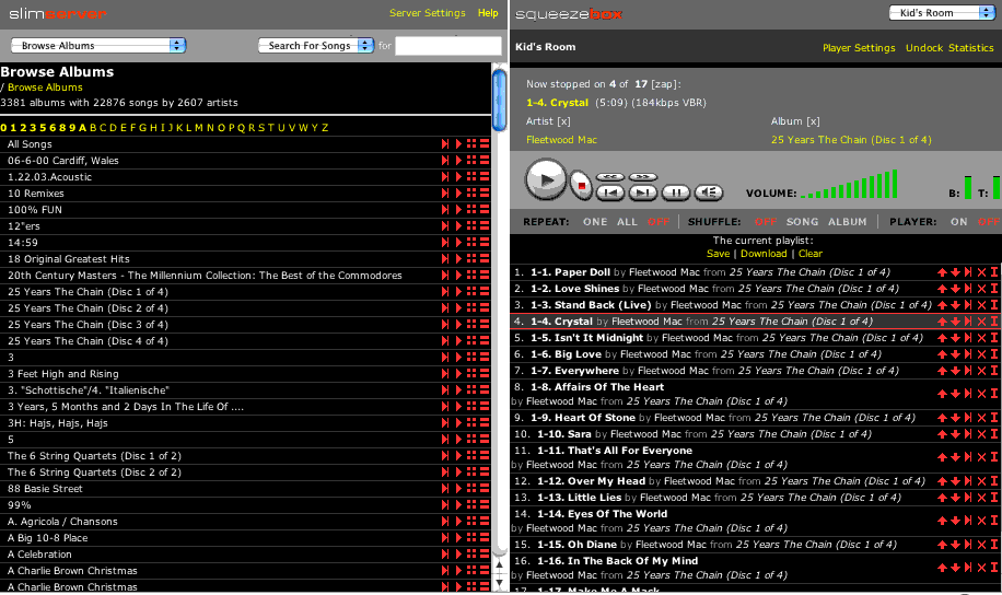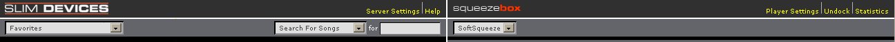That looks awesome! I'm really psyched about this. I think the slimdevices logo looks good, but if you want a SlimServer graphic, I can make one for that space. Couple of notes (I always have notes)... 1. Now that I play with it, why aren't Server Settings and Statistics in the menu with everything else? The menu could be one-stop shopping! (Help's probably ok there, it's for people who get lost. :) 2. Shouldn't the stats page open up on the left? 3. The content in the black area should have a small empty border around it. It should probably be the same number of pixels as between the Slim Devices log and the left edge of the screen. Both black frames should have this. 4. The player settings could go in the menu too, especially because they open up on the left side. If you think it's important to keep the link on the right, then the settings should appear on the right. 5. I'm not sure we need a "Home" link on the left. There really isn't a "Home" anymore with the popup menu for all the left side modes. 6. What do you think of moving the player popup menu down where the player name is? If you did that and the above, the top row would just be the logos on both sides, directly under would be a popup choosing the content on the left pane and the player on the right pane, which are really equivalent. (additionally in that row would be search, which is very useful and undock, which folks seem to like.) 7. The ffwd and rew icons have always looked a little off to me. Do you have original ones that aren't squished like that? 8. The "The current playlist:<br>Save | Download | Clear" could probably be kept on one line. Put "The current playlist:" on the left and the "Save / Download / Clear" on the right. That would save some space and make it a bit more consistent. Sorry for all the notes, but I think this very close to being perfect (these are all little tweaks), feel free to ignore one or all. I'm really psyched about this!!!
