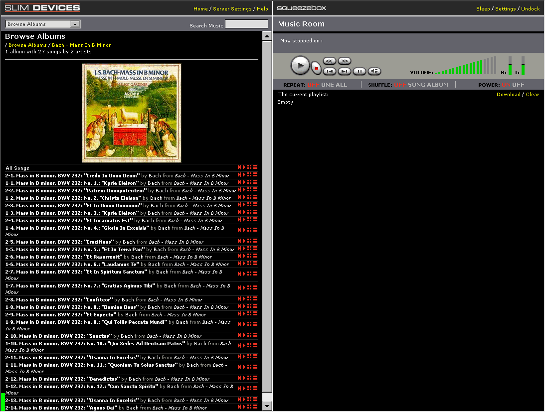 Attached is a screen shot. Note that on the browse/server pane it says "1 album with 27 songs by 2 artists". I have the "artist" tag set as "Bach" and the "album artist" set as "Gardiner" for ALL tracks. I've tested this on several albums both single-disc and multi-disc works with various combinations of these 2 tags set. My conclusion is that when the "album artist" tag is blank, SS shows "1 artist" in the browse/server pane; however, if the "album artist" tag has anything in it, SS shows 2 artists. Seems like that is an error. The info line in the browse/server pane ought to simply say "1 album with 27 songs by 1 artists" when each track in the album has the same artist. This should be so regardless of the content of the "album artist". My conclusion would be so for classical at least since I would think most folks use the "album artist" to house the orchestra, or conductor, or something like that. Perhaps the arguments for pop would be different.