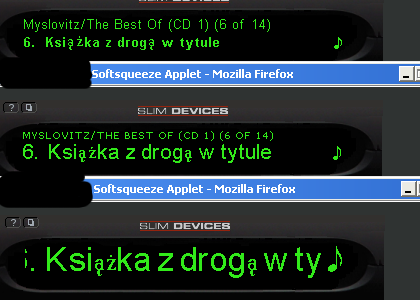 @Dan Sully: I've tried Cyberbit, CODE2000, and five different versions of arialuni (0.84, 0.85, 0.86, 1.00, 1.01). Without a Unicode font, the screenshots I showed you wouldn't even be possible ;) @Dean Blackketter The file I just tried was SlimServer_6_2_x_v2006-03-09.tar.gz I apologize for not having this tested earlier, but since the SB so often needs to be re-setup completely when the server software was down, it always takes quite a chunk of time to test this - hey it's annoying enough if you just want some music while shaving, and to get the SB to run takes longer than the shaving. As always, I had to remove/rename the DBI.pm to get it to run at all. arialuni.ttf still existed (I only overwrite the older folder), I even made a copy name ARIALUNI.TTF, but this version doesn't even Unicode characters any more - the question marks are back. So I went and just renamed the whole slimserver folder and created a new one, where I could test this new version without having any left-overs from previous versions in there. Same problem - Unicode characters are still questions marks again. Finally, since Dan Sully mentioned the CODE2000 font, I renamed the arialuni font and put the CODE2000 font back in - without any change. Fonts are 644, so they're world-readable. As a forth attempt, I changed them to user slimserver & group slimserver as well - still question marks. Both your forum and my old installation folders show that the fonts belong into the Graphics folder, where they are. The upper/lowercase is the same as before (just copied them over), and the same as on your forum (arialuni.ttf ARIALUNI.TTF CODE2000.TTF). You replaced the valid letters with invalid question marks, but hey, the question marks at least have the proper size.