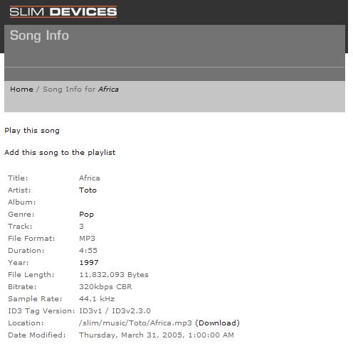 Yep, I agree. But how can I help the developers if even I can't tell if it's empty of null? I've done a full CLEAR and RESCAN, and the problem seems to have resolved itself. This is with me making no changes to the MP3 file itself. Here's the subsequence SQL dump: INSERT INTO `tracks` VALUES (197, 'file:///slim/music/Toto/Africa.mp3', 'Africa', 'AFRICA', 'AFRICA', 39, 3, 'mp3', 1, 1112227200, 11832093, 11830608, 313, 1997, 295, NULL, NULL, NULL, NULL, NULL, 320000, 44100, NULL, NULL, 1, NULL, NULL, 'ID3v1 / ID3v2.3.0', NULL, NULL, NULL, NULL, NULL, NULL, 1, 0, NULL, NULL, NULL, NULL, NULL, NULL, NULL, NULL, ' NO ALBUM 003 AFRICA'); INSERT INTO `albums` VALUES (39, 'No Album', 'NO ALBUM', 'NO ALBUM', NULL, NULL, NULL, NULL, NULL, NULL, NULL, NULL, NULL, NULL); However I've seen this go wrong (and right) in the past, so I think it's definitely some fault in the scanning process. Next time I encounter this issue I'll get the SQL Dump again and report it here - as the Rescan has corrected all the entries.