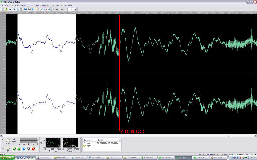More from Sam: Okay, I've uploaded the two files. You have to look pretty carefully at the track change. These tracks are the same ones I used to produce the screenshots (attached to bugzilla posting). You might find the trace is flipped vertically (negated). No idea why. These files also show up bug 2944 where dropouts appear in the audio when streamed native to the Squeezebox (despite 100% buffer fullness).