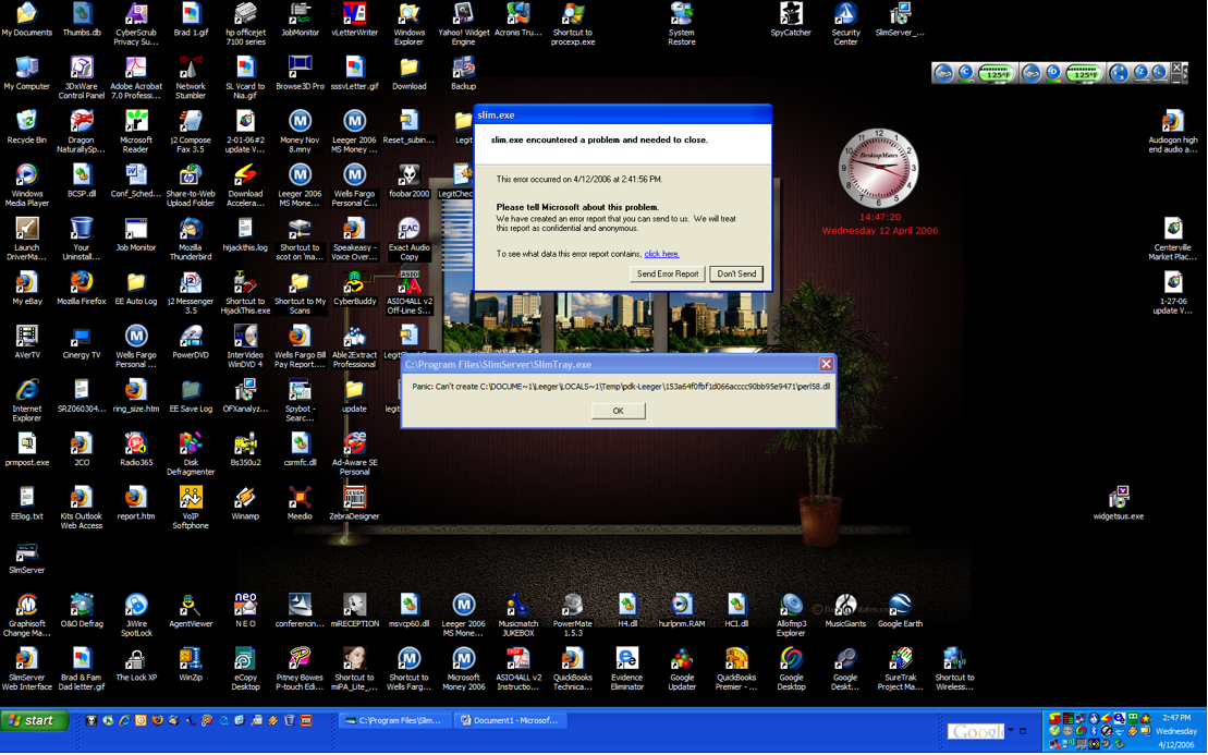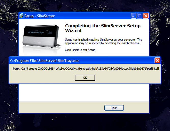 User is getting consistent errors during installation, during startup, and whenever he tries to run Slimserver manually. Please ticket #959. The nature of the errors is usually a "panic" error, for instance: "Panic: Can't create C:\DOCUME~1\[username]\LOCAL~1\Temp\pdk-____\[lots of letters and numbers]\perl58.dll * Had user clean out his Temp folders, uninstall Slimserver, reinstall and he gets same error. * From user: On Apr 11, 2006, at 4:49 PM, [user] wrote: Ok, A. Uninstall Zone Alarm Security Suite. B. SS was already uninstalled. C. Downloaded and installed 6.2.1 D. Installing had the same problem. Panic: Could not create.....Perl58.... E. Completed install after clicking ok on the popup. F. Each time I tried to open SS the same popup Panic. G. Installed patch from yesterday. No joy. H. Reboot. No joy I. Just for good measure I uninstalled 6.2.1 and tried everything with 6.2.2 No joy. * Also from user: On Apr 11, 2006, at 3:56 PM, [user] wrote: 1. Under my login (with full administrator privileges) A. Uninstall SlimServer B. Download the latest SS update from your website. C. Installed this version 6.2.2 dated the 11th. D. There was no problem with the install. E. I started SS and all I get is the little balloon that says starting SlimServer. F. I rebooted the machine. During boot up I get the same (SlimServer encountered a problem and must close. Debug or send report. G. I tried to start SS again. No joy. H. I installed the patch you sent me yesterday. It installed. I. I rebooted the machine per your instructions. Same popup during boot. J. I tried SS again. It still would not start and I get the old Panic popup. K. I uninstalled SS and restarted the machine. L. I logged on this time as the ADMINISTRATOR M. I repeated items A thought J with the same results. * Then, on April 13, I spoke to Scot... walked him through: 1. walked through running slim.exe in a command window. he got a panic error. 2. rebooted system into Safe mode. Uninstalled Slimserver and reinstalled. There was a panic error during installation. 3. rebooted into normal mode. During Startup 2 errors popped up: a general error on slim.exe, as well as a panic error on perl58.dll See ticket #959 for contact information.