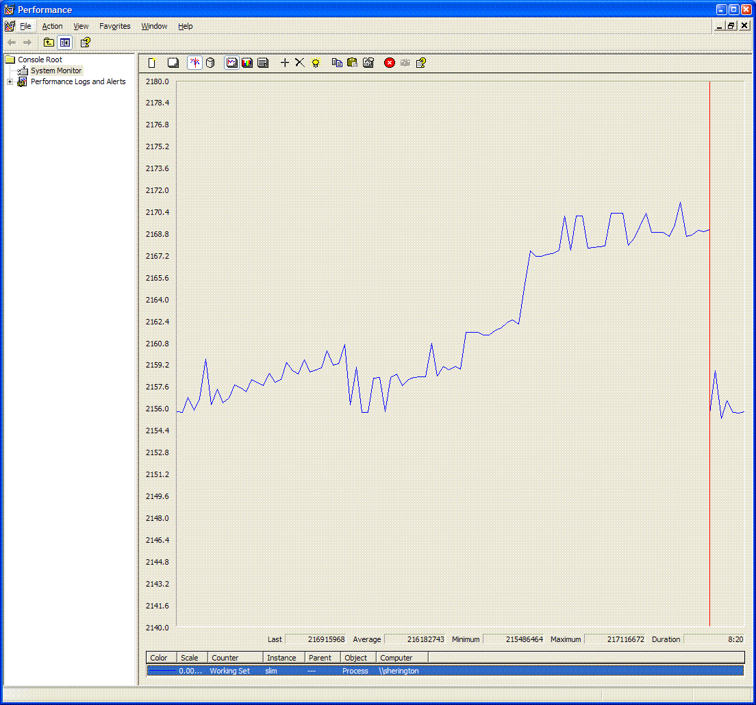 Created attachment 1697 [details] Screen capture of Performance Monitor monitoring slim.exe This is a screen capture of performance monitor tracking working set of the slim.exe process (remotely). Note, the period of the graph is 8m20s.