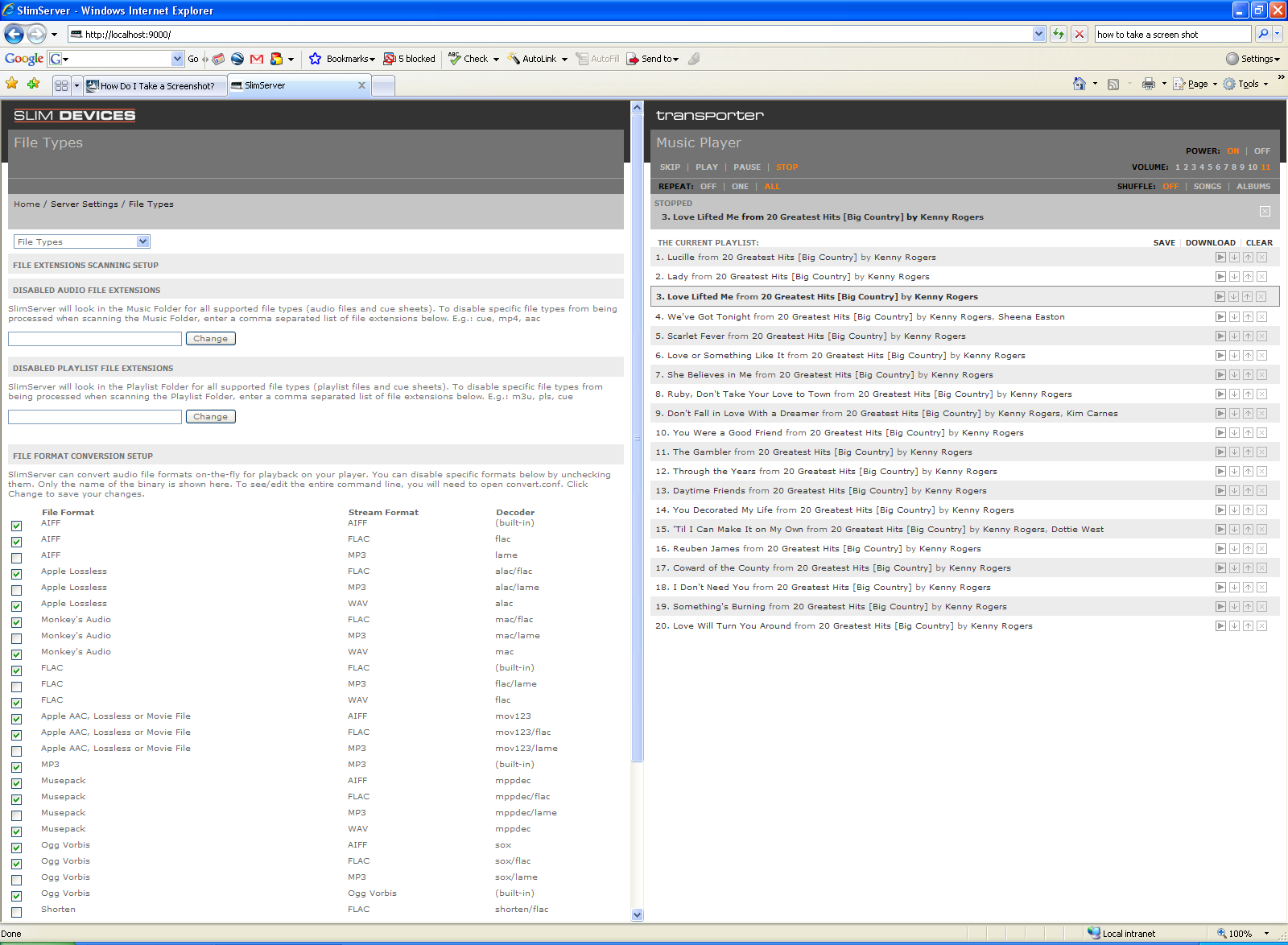 While service is stopped, from command prompt (start->programs->accessories->command prompt: c:\program files\slimserver\server\slim.exe --d_source Worth noting as a starting point for any playback failure. This will reveal the command being used, thus uncovering any file types settings problems, missing binaries, etc. It will also show any cases where the trancoding application is failing, or any error messages that the server throws due to codec issues.