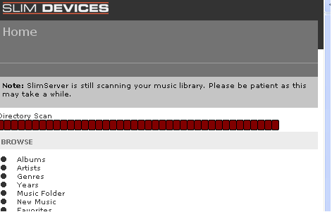 System Info: Gateway, P4, 2.00 GHz, 256 MB of RAM, XP SP2 ENU Perl Version: 5.8.8 MSWin-32-x86-multi-thread MySQL Version: 5.022-community-nt Steps to Reproduce: 1. On a clean ghost of XP SP2 ENU, install SlimServer 7.0a1 of build 2007-03-22. 2. Reboot system. 3. After reboot, start SlimServer and its Web UI. 4. The reddish progress bar for scanning Music Folder appears. 5. Wait about 20 minutes. 6. Notice the bar does not go away. It seems to be stuck there. Work Around: Press teh F5 key to refresh the screen. This could be a Microsoft bug. IE may not be refreshing.
