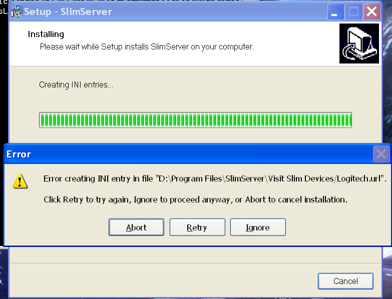 System Info: Dell, Optiplex GX620, 2.79 GHz, 0.99 GB of RAM, XP SP2 ENU Steps to Reproduce: 1. On a clean ghost of XP SP2 ENU, install SlimServer 6.5.2 of build 2007-03-28. 2. During the installation, notice there is an error message box pops up saying "Error creating INI entry in file "D:\Program Files\Visit Slim Devices/Logitech.url". (Please see attachment No. 1.) Note: Click "Retry" does not help. Click the "Ignore" button, the installation process finishes. However, the SlimServer cannot be started. (Please see attachment No. 2.)