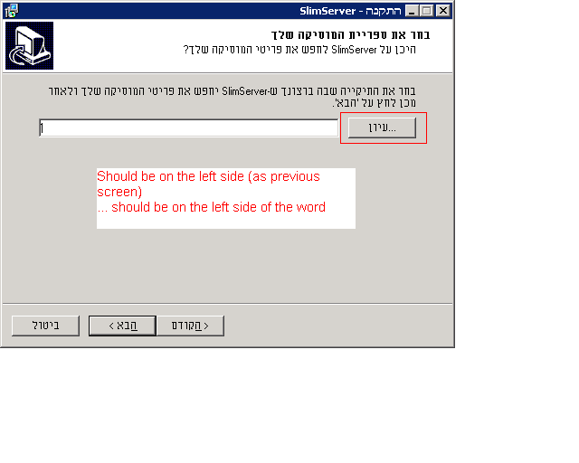 Issue found by translators testing Hebrew version of SlimServer. Using either May 12 or May 13 2007 version. Michael H suggested deferring to post-6.5.2. Reassign to Michael H. Screenshot appended with issue circled.