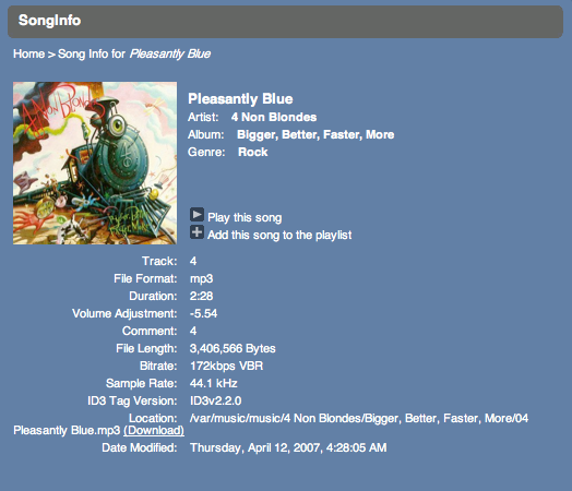 A couple of things I noticed on the song info page . The title in the grey area should just be the song title, not "SongInfo" or "Song Info for <songname>" The location (and I suspect other items that were long enough) should wrap on the left side to align with the beginning of the text, not all the way on the left portion. The text to the right of the p;lay and add buttons should be centered vertically with the buttons. See attached screenshot for reference.
