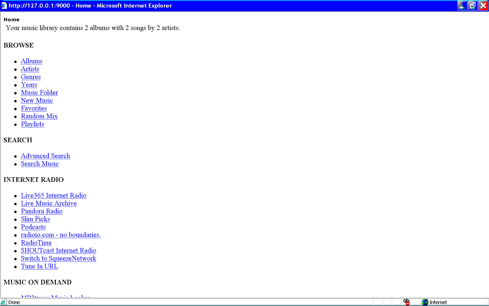 System Info: Gateway, P4, 1.97 GHz, 1.25 GB of RAM, XP SP2 ENU VERSION INFO SlimServer Version: 7.0a1 - 12905 - Windows XP - EN - cp1252 Perl Version: 5.8.8 MSWin32-x86-multi-thread MySQL Version: 5.0.22-community-nt Steps to Reproduce: 1. Start SlimServer and open the web interface. 2. Click the "Player Settings" button on the bottom right corner. 3. On the IE windows that pops up, click the "Home" link. 4. A IE windows of SlimServer "Home" page pops up. 5. Notice the bottom is cut off. There are more stuff under the "Music on Demand" category.