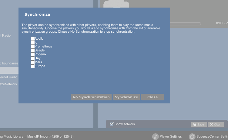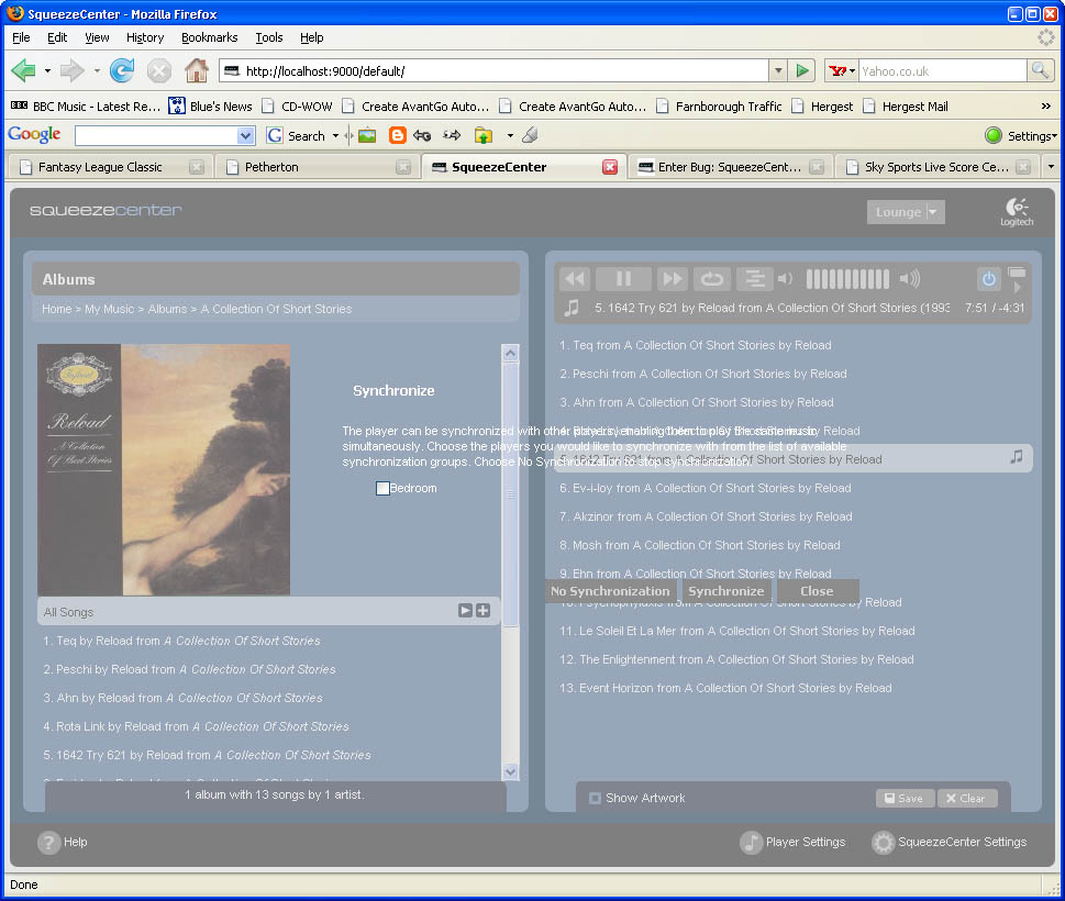 I had a quick look in the Firebug console after clicking on the Synchronise option. I can see lots of long-running requests to "POST http://localhost:9000/jsonrpc.js", "ext-base.js (line 12)" (all around 30 seconds). Request Headers Host localhost:9000 User-Agent Mozilla/5.0 (Windows; U; Windows NT 5.1; en-GB; rv:1.8.1.7) Gecko/20070914 Firefox/2.0.0.7 Accept text/xml,application/xml,application/xhtml+xml,text/html;q=0.9,text/plain;q=0.8,image/png,*/*;q=0.5 Accept-Language en-gb,en;q=0.5 Accept-Encoding gzip,deflate Accept-Charset ISO-8859-1,utf-8;q=0.7,*;q=0.7 Keep-Alive 300 Connection keep-alive X-Requested-With XMLHttpRequest Content-Type application/x-www-form-urlencoded Referer http://localhost:9000/Default/ Content-Length 68 Cookie SqueezeCenter-noPlaylistCover=1; Fishbone-Style=null; SqueezeCenter-player=00%3A04%3A20%3A05%3Aac%3A35; SlimServer-player=00%3A04%3A20%3A06%3A38%3A3c; SqueezeCenter-homeMenuExpanded=MY_MUSIC; SqueezeCenter-expandPlayerControl=true; SqueezeCenter-fishbone-showtext=1; SqueezeCenter-albumView=; SqueezeCenter-Browserpage=BROWSE_NEW_MUSIC Authorization Basic SGVyZ2VzdDpzbGltc2hhZHk= Pragma no-cache Cache-Control no-cache Post {"id":1,"method":"slim.request","params":["",["serverstatus",0,99]]} Response Loading... I don't know if this is normal? If it is, I don't know what else to look for.