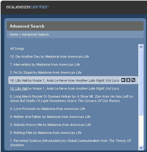 If I use advanced search to find songs, sometimes I see duplicate tracks listed in the results. In the new default skin, the second occurance of the duplicate song cannot be highlighted. In the example screenshot for example, the cursor was hovering over the second occurance of the track named "Lily Hall", but the first occurance is highlighted. I have checked the url for both hits - they are both for the same file.