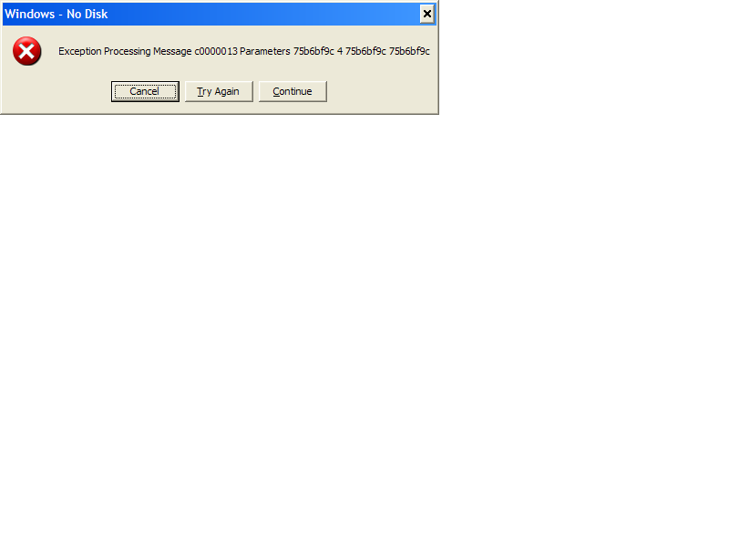 (comment from Michael Herger 2007-11-02 16:10) I remember having seen similar messages with empty diskette drives. Do you by any chance have an empty CD-R in your drive or something else Windows can't read? Or a flash card reader without flash cards? If you do, try removing them and see whether this behaviour is reproducable. The white screen imho is due to some timeout, very likely due to the above issue.