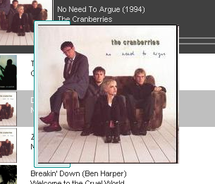 The second part of the original bug report hasn't been responded to yet: [In the left-hand browse frame] "When album artwork is displayed, it is not possible to hover over the image or click the image to see the image in full resolution, which is inconsistent with the currently playing track artwork image." I find artwork inconsistent everywhere now: In browse frame, there are no hover-over pop up images; clicking on the artwork in a list (eg browse albums list) opens the album; clickin an the artwork in album view or song view opens the large artwork in a new window. In the Now Playing frame, there is a hover-over image; clicking the image takes you to that album in the browse frame. In the Current Playlist frame, there is no hover-over image; clicking the image takes you to that album in the browse frame. I don't particularly mind; it was just an observation that just about every use of artwork hover/clicking is different!