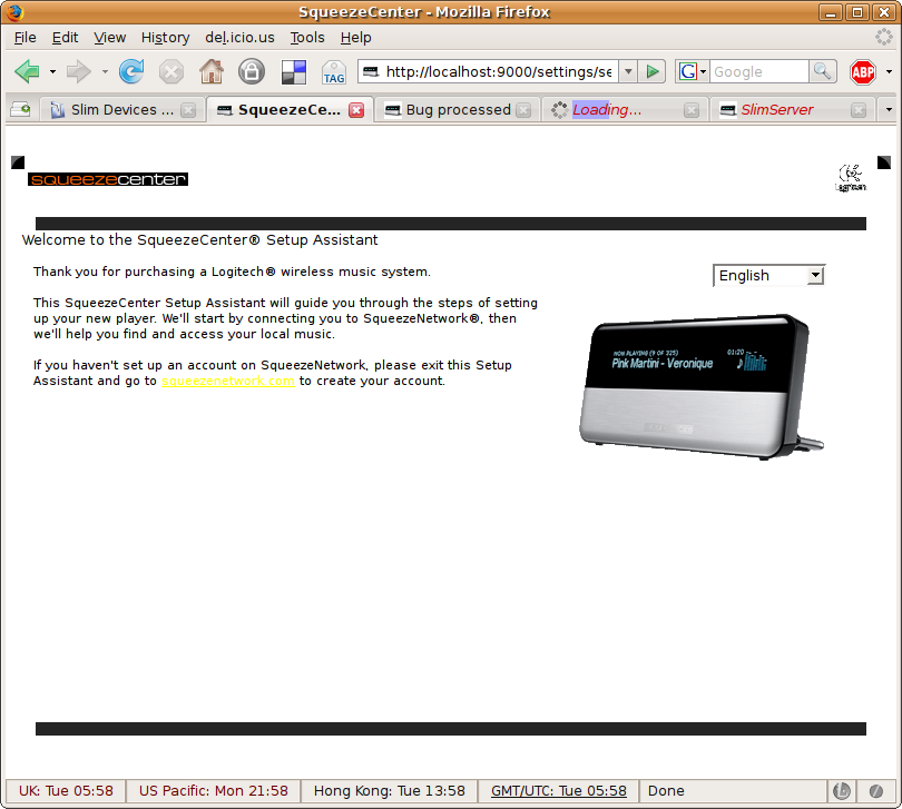 I get a really confusing page as the first page in the Setup Wizard. I'm not sure if something is wrong with my installation or if something is just not working. I'm using the latest svn version on Ubuntu Gutsy 7.10 with Firefox 2.0.0.8 I'm starting SqueezeCenter with: slimserver.pl --cachedir /var/lib/slimserver/Cache70Small --prefsdir /var/lib/slimserver/Prefs70Small --logdir /var/lib/slimserver/Logs70 --d_startup The specified cache and prefs directories exists and are empty. Problem 1: It feels like a stylesheet is missing Problem 2: I have no idea what to do, according to the text I should probably enter my SqueezeNetwork information somewhere, but there are no fields Problem 3: I'm sure the market guys aren't going to be too happy about the look of the Logitech logotype I'll attach a screenshot that shows what I'm seeing.