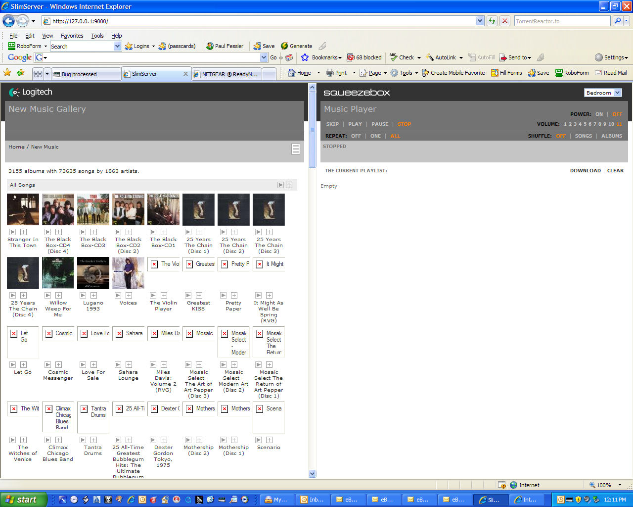 After a complete delete and rescan - UI for Slimserver does not show all art work, some show some don't. Then when trying to switch to list view, slim server stops, UI says page not found. I have to start slimeserver again. Slim server version SlimServer Version: 6.5.4 - 12568 - Windows XP - EN - cp1252 Server IP address: 192.168.1.2 Perl Version: 5.8.8 MSWin32-x86-multi-thread MySQL Version: 5.0.22-community-nt Your music library contains 3155 albums with 73635 songs by 1863 artists. Audio files stored on NV+ Hostname: ReadyNAS Model: ReadyNAS NV+ [X-RAID] Serial: 000da2013605 Firmware: RAIDiator 4.00c1-p1 [1.00a037] Memory: 1024 MB [2.5-3-3-7] MAC address: 00:0D:A2:01:36:05 IP address: 192.168.1.4 Gateway: 192.168.1.1 DNS: 192.168.1.1 Volume C: Online, X-RAID (Expandable RAID), 4 disks, 70% of 1363 GB used