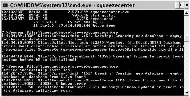 I installed the special Windows SqueezeCenter version from December 10th while SqueezeCenter was still running. After the installation finished, Squeezecenter was never up and running. I took a look, and started up SqueezeCenter manually. I got an error "Slim::Schema::forceCommit <1358> Warning: Trying to commit transactions before DB is initialized!" I uninstalled SqueezeCenter and reinstalled it. This time it started up just fine without any intervention from me. Screenshot follows.