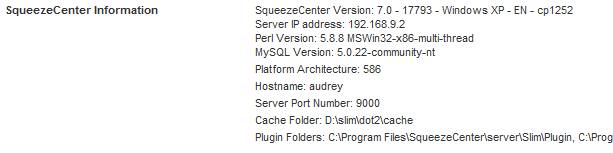 I have my cache and prefs moved to other locations in the filesystem so that the SqueezeCenter installation can remain unchanged and be easily replaceable. I do this with the startup options --prefsfile --prefsdir --cachedir. However, the web interface is still showing the default locations of those things under settings->status: SqueezeCenter Version: 7.0 - TRUNK - Linux - EN - utf8 Server IP address: 192.168.100.3 Perl Version: 5.8.8 i686-linux-thread-multi MySQL Version: 5.0.44-log Platform Architecture: i686-linux Hostname: discovery.hickinbottom.com Server Port Number: 9000 Total Players Recognized: 2 Cache Folder: /usr/local/squeezecenter/server/Cache Preferences Folder: /usr/local/squeezecenter/server/prefs Plugin Folders: /usr/local/squeezecenter/server/Slim/Plugin,/usr/local/squeezecenter/server/Plugins It is the "Cache Folder" and "Preferences Folder" that I believe are incorrect (the other entries look OK). This is with svn 15529.