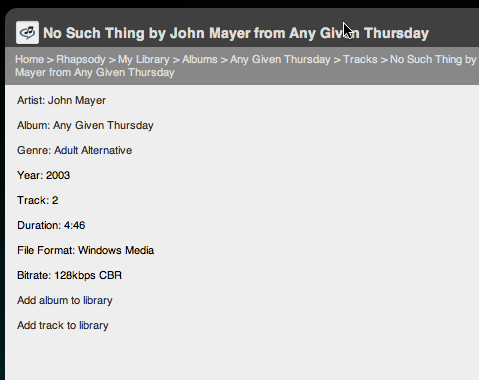 If you click on a Rhapsody song title in the playlist, you get a different song info screen than if you drill down to: Home > Rhapsody > My Library > Albums > Album Name > Tracks > Song Name If you drill down to an album that only has one song in your library, you get a third screen. See attached images.