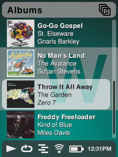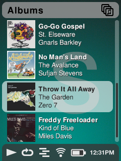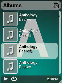 Ok. Almost as niggly as the full stop/period after "Free your Music" but I notice that when fast scrolling those new large background characters indicating whearebouts you are in the list are centred vertically on the whole width of the screen and vary in width. This leads the edges of many of them to be overlaid by, and interfere with, the album art or placement graphics and so ends up looking a bit sort of scrappy and messy. I think it might be better if these background characters were not vertically centered on the whole screen but only centered on the part with the description text in it (i.e. not including the album art). Then the width of the characters ought to be set such that they never interfered with the album art. This would look neater and more cohesive.