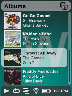 I almost wonder if you're joking! I'm afraid it's very difficult to provide an image as I would be scrolling quite fast before the large background characters would show. And then I'd have to take a snap with my electronic camera (with associated delay) at exactly the time one of the wider characters shot past. I've read my post and I don't think I can make it any clearer (sorry). The left hand side of the new background characters characters mixeswith/interferes with/is overlaid by/ the album art. I think the large characters should not be vertically centered on the whole screen but just on the part with text on (i.e. excluding the album art), and then the width/size of the characters set accordingly so that they did not mix it up with the qwl=buim art but kept clear of it. Sorry, I can't get any clearer. Can anyone else help?