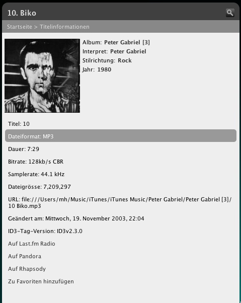 When applying this to the core, remember to also add similar support to: Jive interface in: Slim::Control::Queries songinfoQuery Web interface in: Slim::Web::Pages addSongInfo The web interface additionally also needs a rework of songinfo_details.html which currently hard code the information that should be shown instead of reading it from a hash/array.