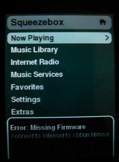 Jive FW: 7.0 r1915 Steps to Reproduce: 1. Connect a Jive to SqueezeNetwork and update the firmware. 2. After reboot, start using it. Things seems to be fine. Music and voice can be streammed via a Ray. 3. Notice once for a while, a brief message box appears on the bottum of the Jive. It says something about the firmware is missing. It cannot connect to the network to find the firmware. 4. The FW had just been updated, and it is doing fine. This is a very confusing message. Note: This bug has been set to P2 and major becuase it is very VISIBLE, confusing, and, again, VISIBLE. Normally non-functional bugs do not receive high priorities.