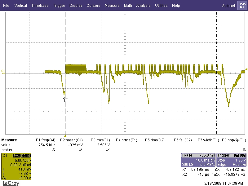 Could this be due to the lighting in SZ? Is it blacked out? We used to have a ton of problems in the lab until the electrician replaced all the ballasts in the overhead lights. I don't quite trust david's measurements because he wasn't measuring the right thing, and he was using an analog scope which makes it difficult (or near impossible) to determine what's sent. There are 2 stages to verify that the IR works: #1 verify that we get enough current through the LED when switching (i.e. that the LED turns on and off properly with the GPIO pin). This is best done with a scope with a current probe. <--- Verifying hardware. #2 Verify the timing of the signals. This is best done with a logic analyzer. <--- Verifying Software -Caleb