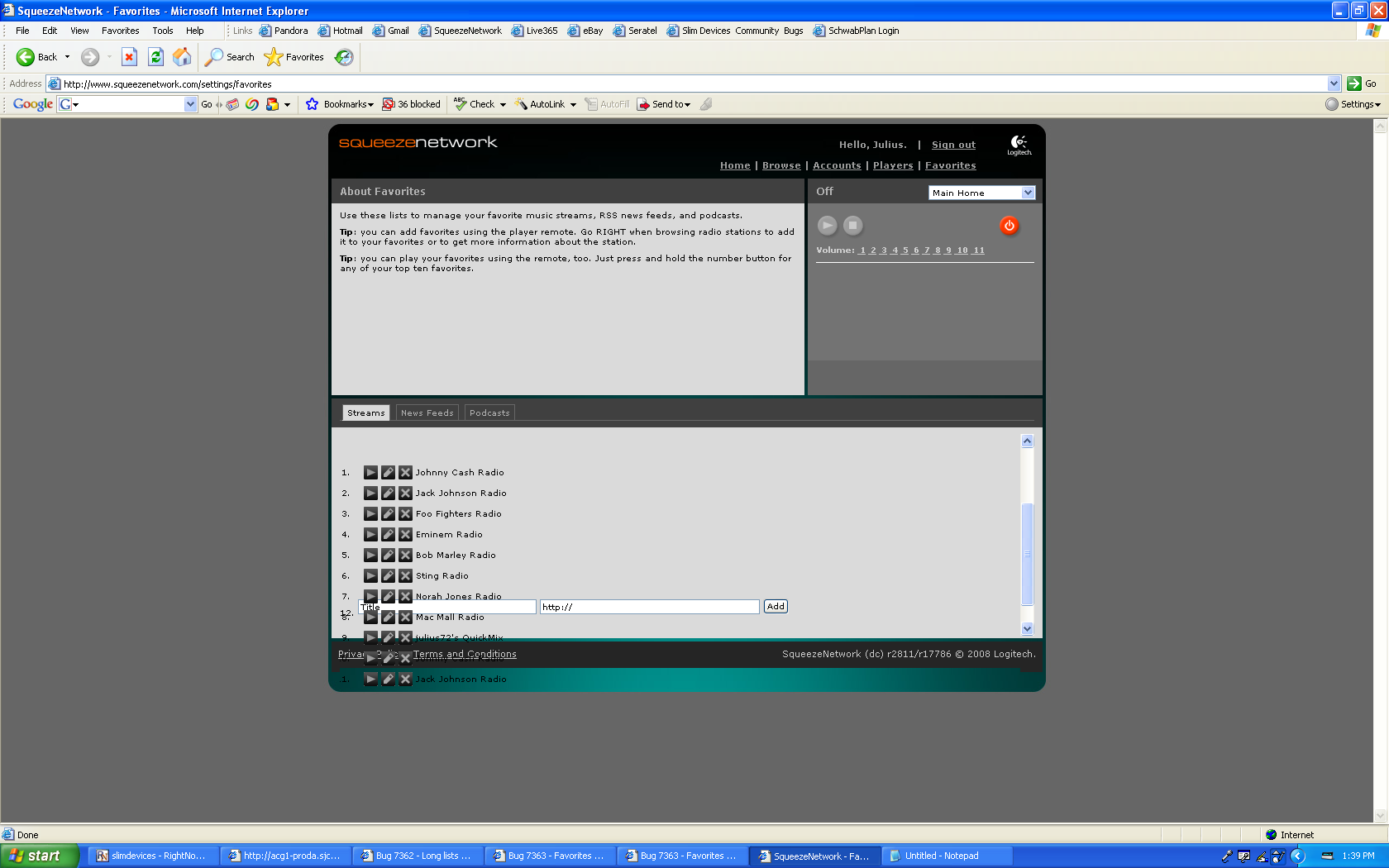 I have been able to replicate an issue that a few customers have reported. It only occurs in Internet Explorer and I have reproduced this in both IE 6 and 7. If you have a list of Favorites longer than five, the rest of them do not display correctly and overlap the page. Overlap meaning the list goes past the borders and overlaps other items that are on the page. This does NOT occur in other browsers like Firefox and Safari.