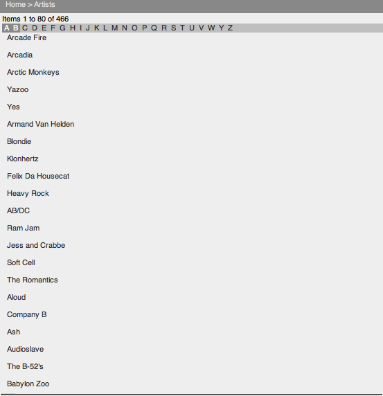 Created attachment 3211 [details] Artist List WITHOUT "Use iTunes" option set (manually specifying music folder) This is the current state after I stopped letting Squeeze Center use iTunes library and instead set basic settings Music Folder to point to my music. Tagging still done in iTunes.