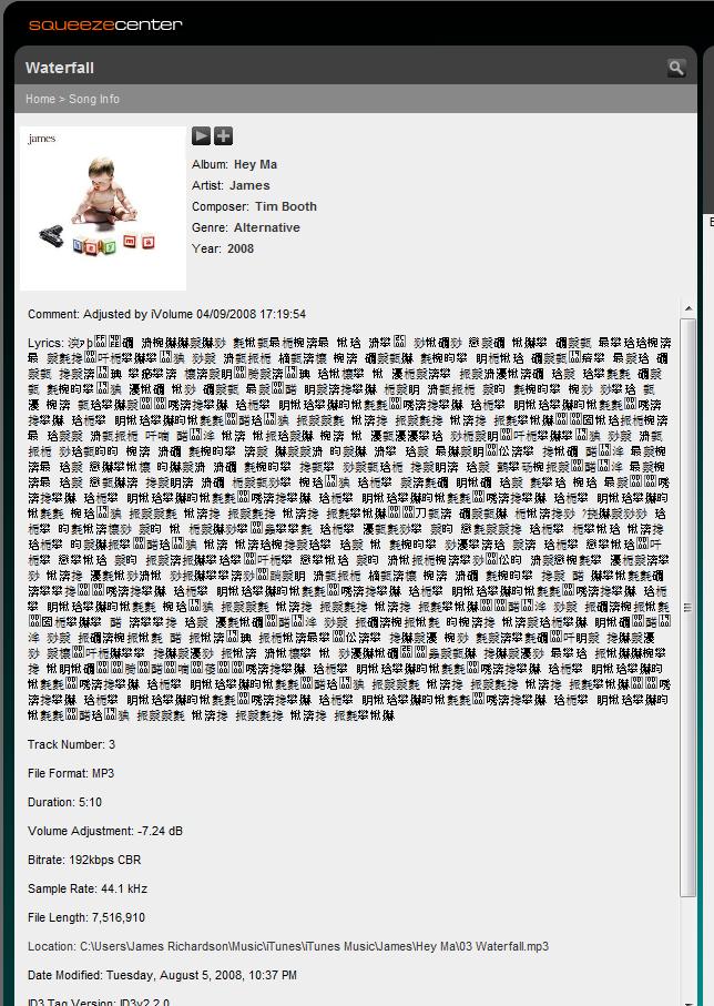 Created attachment 3240 [details] MP3 file with tags and lyrics A number of my songs with lyrics that display normally in iTunes and other audio software have the lyrics displayed as indecipherable foreign characters. I have attached a file with a song that exhibits the problem.