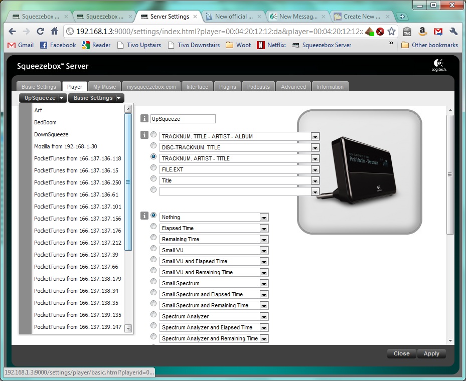 I'm planning to use a squeezebox with a slimserver on an internet server and not local lan server, so I can listen to my collection even if I'm not at home and don't have to run a server at home. I fiddled a little around with the server and noticed that it creates for each IP address it's own playing list. Now it would be nice if you could pass with a parameter what mp3 playing list you want to use. Like: http://...:9000/stream.mp3?name=blah, so you can listen to your list even if your ip address changes. The Squeezebox could also send its mac address as name, so it's uniquely identified even if the ip address changes (I don't know if it does it or not, I don't have yet one, but planning to buy one) I also want to give my family access to my mp3s, but they shouldn't be able to access the admin area. An option for creating different user group which can't make any server settings modifications and only edit it's own player settings would be nice.