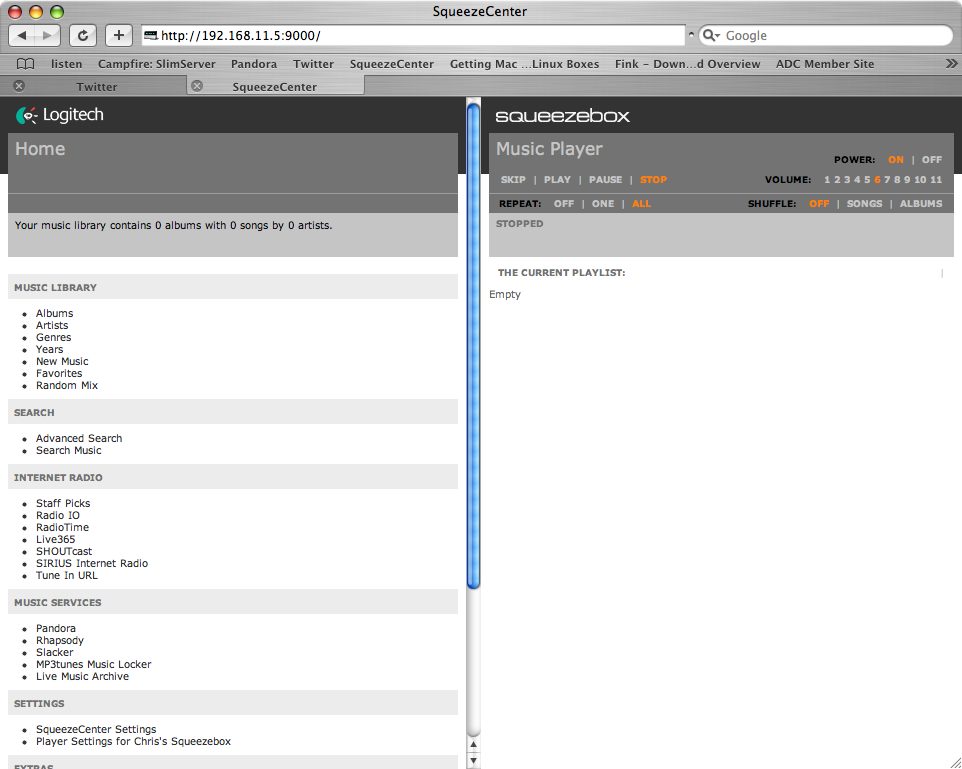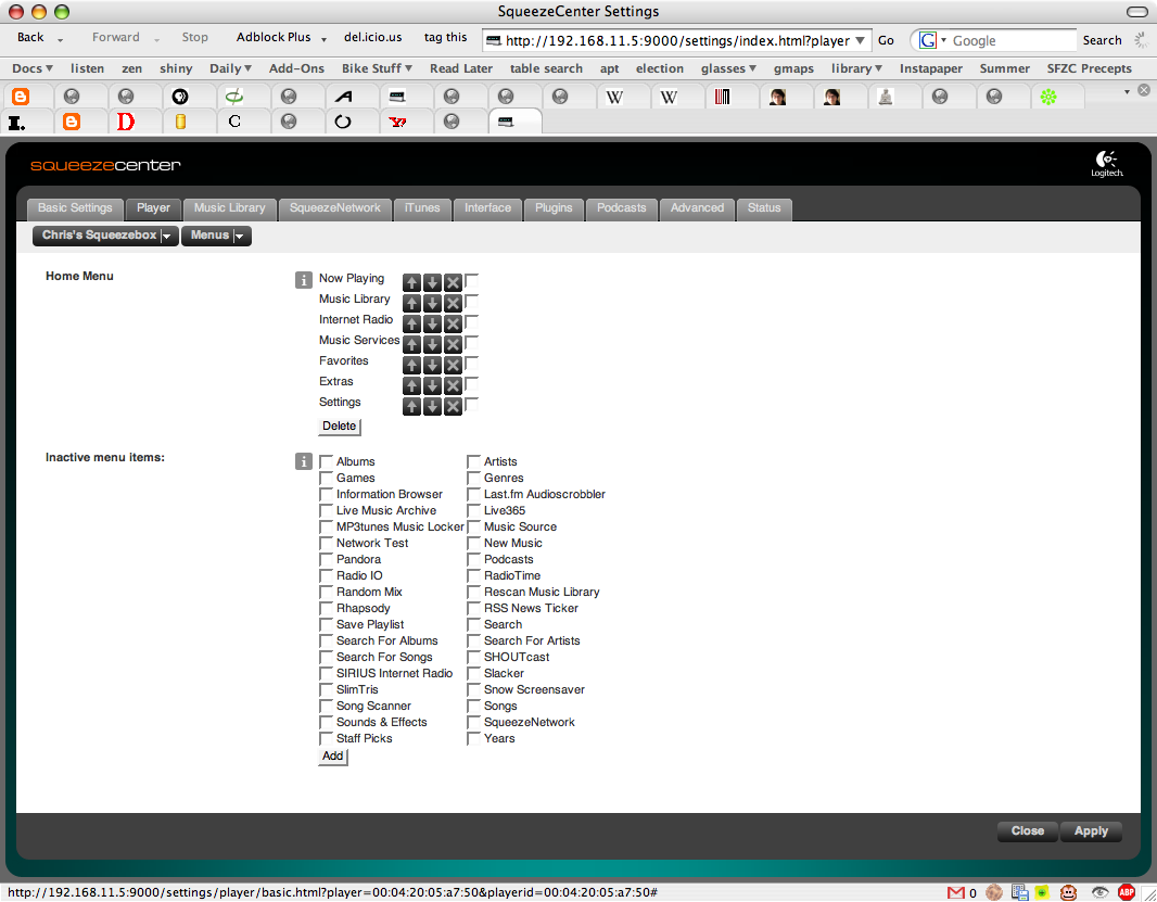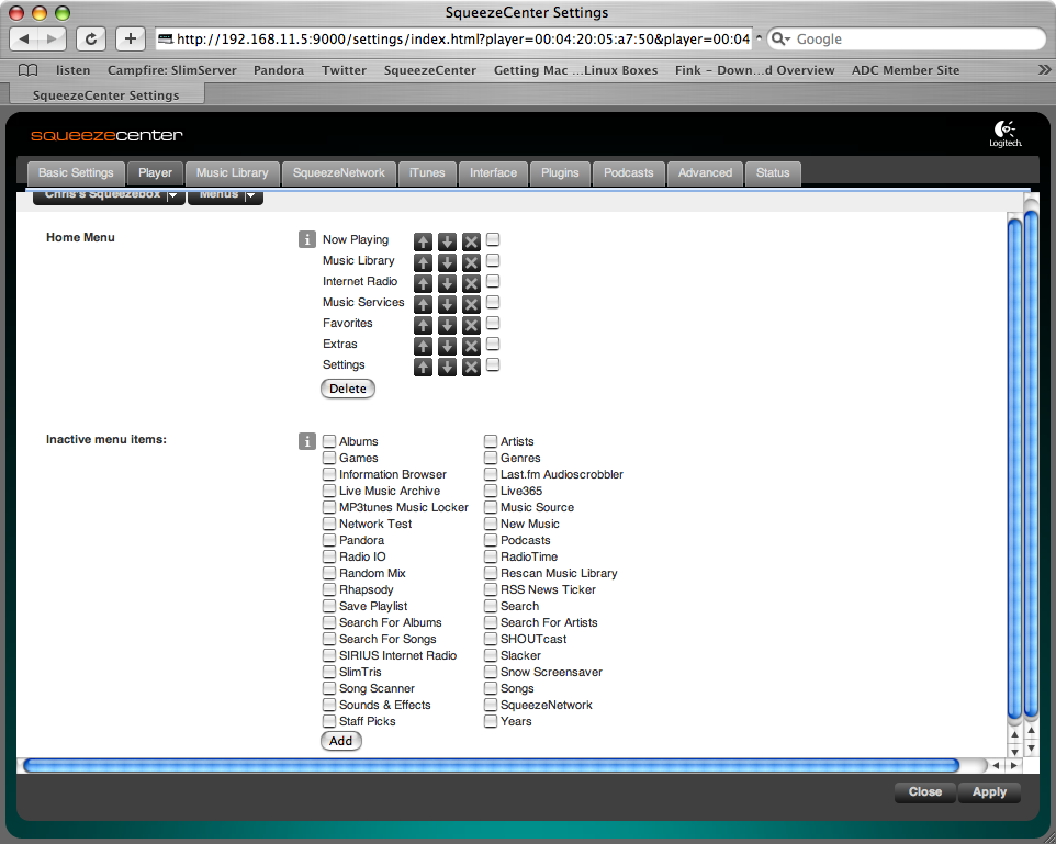 Screenshots attached from OS X 10.4. Updated SqueezeCenter 7.1 to r19915. OS: OS X 10.4 and 10.5 (tested on both) Browsers: Safari/WebKit r33023 and Firefox 2.0.0.14 Cache is clean on both. "Playlists" is also missing from the "Classic" skin, in both the web interface, and the ability to put it into the player's top-level menu. I tend to use Favorites as a subset of Playlists, since Playlists also contain albums in heavy rotation--anyway, it seems reasonable to have both. What OS are you on? This seems like a very strange thing to be OS-dependent, if that's the case; unfortunately I don't have a Windows or Linux desktop handy, but I guess that's the next step.