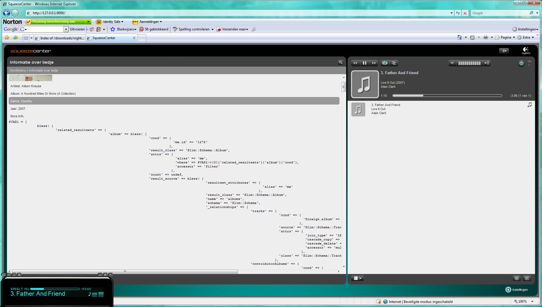 When I open a track of an album in Squeezecenter (Info about track / Informatie over liedje) the webinterface (left screen) shows some XML code. See screenshot. Squeezecenter Build 21126 on Windows Vista, IE 7.0. I didn't experience this error with earlier builds.