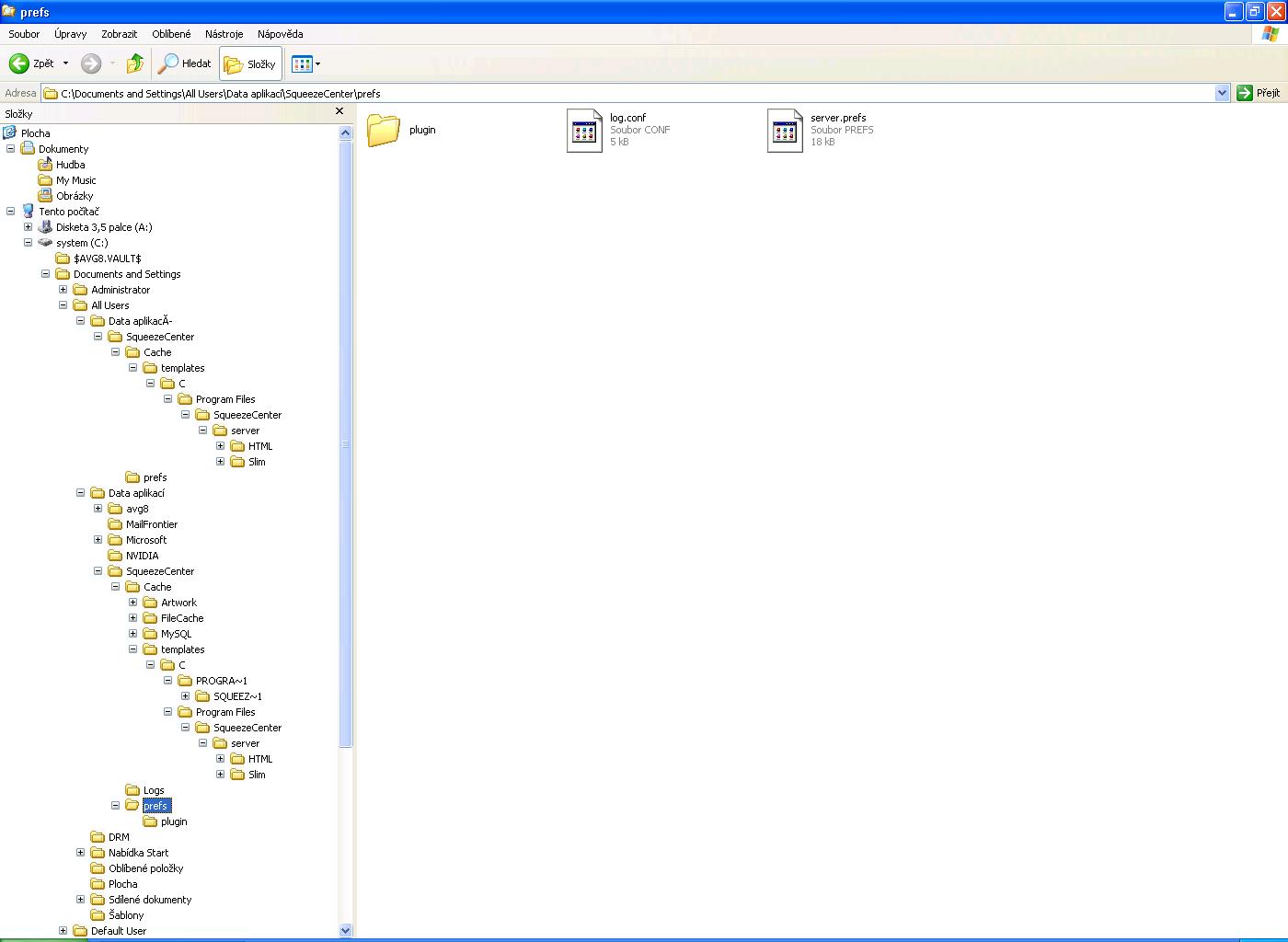 > 2. I have found the folder C:\Documents and Settings\All Users\Application > > Data\SqueezeCenter\prefs > But there is no file inside the folder, even I made the browser to show hidden > and system files > 3. You should also know, that in CZ Windows, the folder has different name > C:\Documents and Settings\All Users\Data Aplikací\SqueezeCenter\prefs Do you have SqueezeCenter folders in both places, the localized and the English version? If so, are they identical, or are they independant?