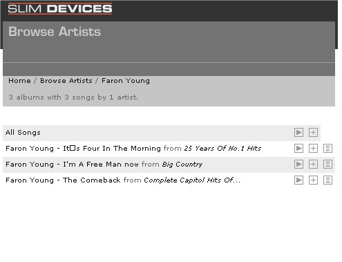 With a clean install of the 16 Mar build on XP I made a subset of my music directories, containing four albums that have cover art and tracks with apostrophes and one album that has a track with an apostrophe but no cover art. I scanned without MusicMagic and opened the web interface in IE on XP. I got the placeholder thumbnail for one album, the other three displayed correctly. All the albums have the tracks listed when I click on them but all the apostrophes show as squares. I then ran MusicMagic, scanned the test directory, deleted the Slimserver cache and restarted Slimserver. Now I am missing all of the files that have an apostrophe in them and the artwork is only displaying for two out of four albums and there is one placeholder thumbnail. I was going to zip up and upload the test directory but it is 66Mb, although it is not a problem for me to upload it if it will help.