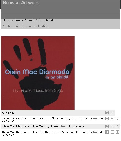 When browseing by artwork I have noticed that it stops displaying covers, whenever the album name contains accented characters. Enabled --d_artwork and it shows it stopping at the last displayed cover, but nothing for the missing ones. Firefox status shows it "waiting for localhost." If I click on the >> to go to the next page it does resume but will stop again, when it has another accented character. My first album with an accented charater is file:///O:/My Music/Caetano Veloso e Gilberto Gil/Tropic�lia 2/01 Haiti.mp3 I'm also using moodlogic, with no Audiodir defined.