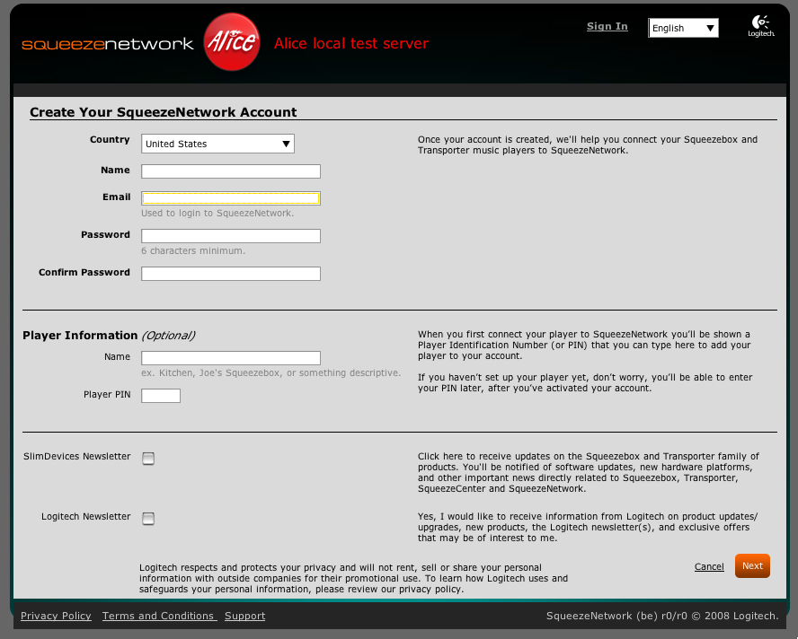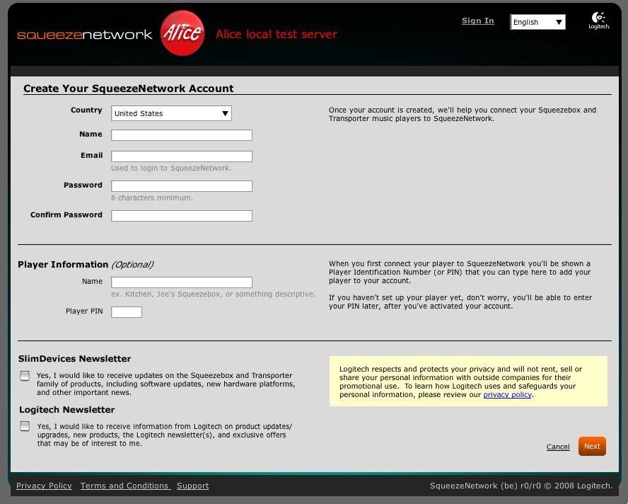 Slimdevices newsletter text (Empty checkbox needed): Click here to receive updates on the Squeezebox and Transporter family of products. You’ll be notified of software updates, new hardware platforms, and other important news directly related to Squeezebox, Transporter, SqueezeCenter and SqueezeNetwork. Logitech Newsletter text(Empty checkbox needed): Yes, I would like to receive information from Logitech on product updates/upgrades, new products, the Logitech newsletter(s), and exclusive offers that may be of interest to me. E-mail type text/html (Empty checkbox needed-only if either/both newsletter boxes checked) and neded in a smaller text size below the opt-in texts: Logitech respects and protects your privacy and will not rent, sell or share your personal information with outside companies for their promotional use. To learn how Logitech uses and safeguards your personal information, please review our privacy policy.