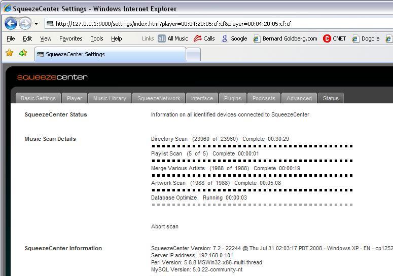 I downloaded SC 7.2 - 22618, fired up a "Only rescan playlists" , clicked Scanning - View Progress, the SC Status Tab screen comes up, Playlist Scan, Merge Various Artists, Database Cleanup #1 and #2 all complete. Database Optimize Running 00:00:07 stays on screen until I either hit refresh or click another tab e.g. Basic Settings, then click Status and then I get the message "SqueezeCenter has finished scanning your music collection.00:06:36" There is nothing in the Scanner Log File, and only hickinbottoms creative English messages in the SC Log File - [08-08-16 08:29:35.0032] Plugins::LazySearch2::Plugin::scanDoneCallback (2034) Lazifying database items not already done [08-08-16 08:30:04.7781] Plugins::LazySearch2::Plugin::lazifyDatabase (2071) No database items require lazification Now, this isn't a showstopper, but unless you are aware of it you can get caught waiting for the scan to finish if you rely on the Status screen.