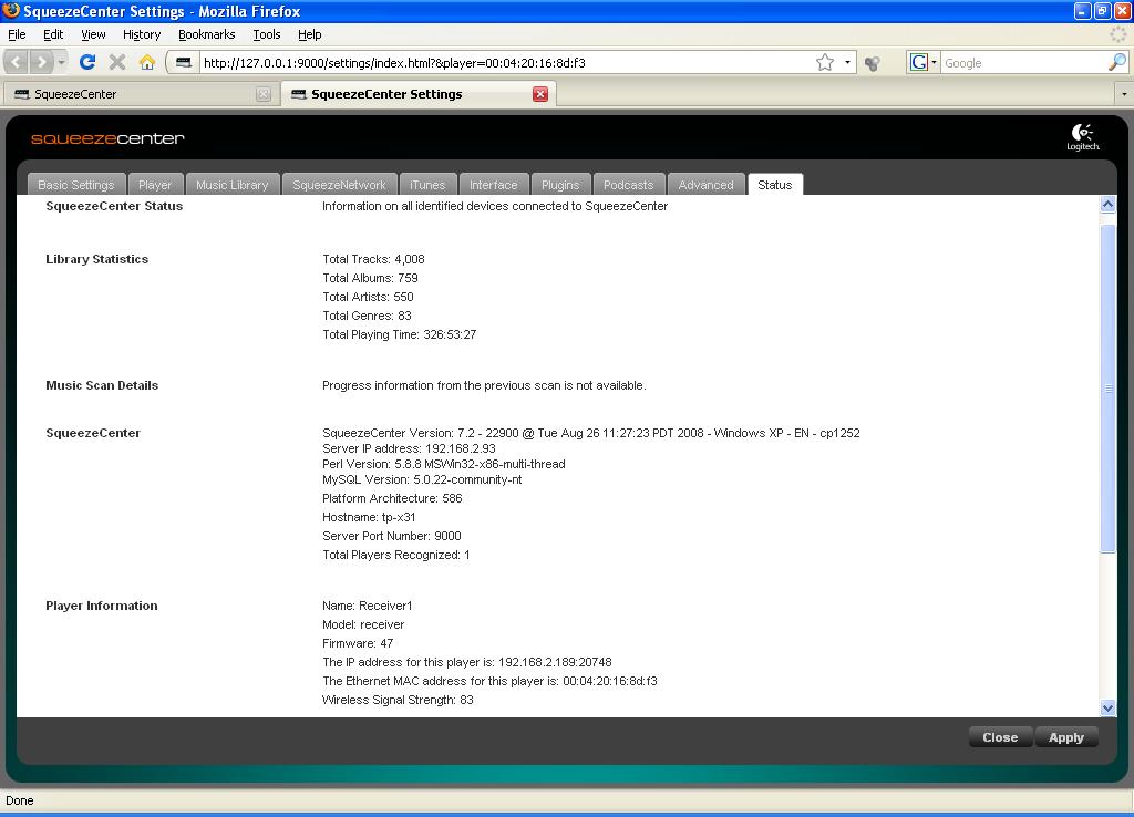 While it's possible this is a hardware specific issue, I'm doubtful. I believe this to be a software issue, possibly network but that's unlikely too. You're of course welcome to RMA if you'd like, Anoop will gladly help you get a replacement Controller. I'm only concerned the issue will be the same with a new Controller, and I would hate to have you wait just to be disappointed again. Did your testing show any success? I take it you've got an older adapter that doesn't support WPA, now I understand why you're using WEP. Please let us know how it goes with SSID broadcast enabled and mac address filtering disabled. Ubuntu does not have a firewall. Ubuntu would be a great test bed, are you certain SqueezeCenter is running on your Ubuntu machine? You can see the web interface etc?