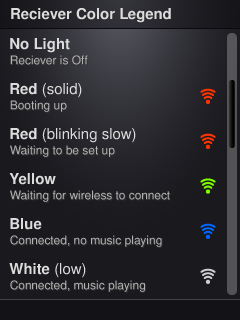 Under settings, we need to create an on device reference guide for the receiver led indicators colors. example: One screen that displays the various color configurations [white, green, red, blue, etc.] as they appear with text descriptions to the right. Is there a post of all the different config's I can use to create a mock-up?