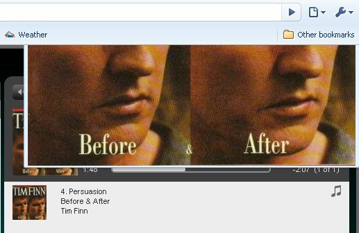 Now Playing artwork is not appearing correctly using IE7 or Chrome. Attachments show results of hovering mouse over 'now playing' artwork. When hovering over the top of artwork the artwork appears beneath, in the main browser window (correct rendering). As seen in attachment, when hovering over the bottom of artwork artwork disappears off the top of the browser window.