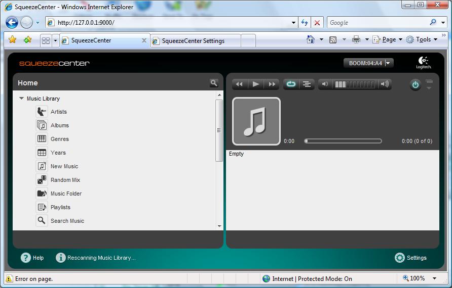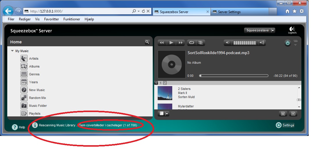I am now seeing this on both my home server(win32) and at work(win64); In both places I use IE9. The main web page states: "Rescanning Music Library... Gem coverbilleder i cachelager (1 of 708)" Hmm btw SBS is setup to English, but the artwork part above is in Danish!? Not sure if the following is an error, as I normally go to the Information page after starting a scan: The Basic settings page remains on "Scanning - View progress" and disabled combobox. But is updated if going to Information page and back.