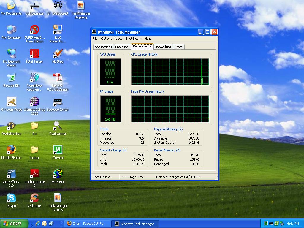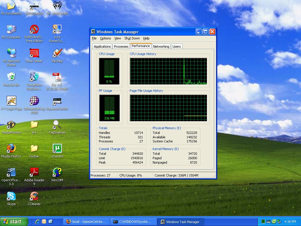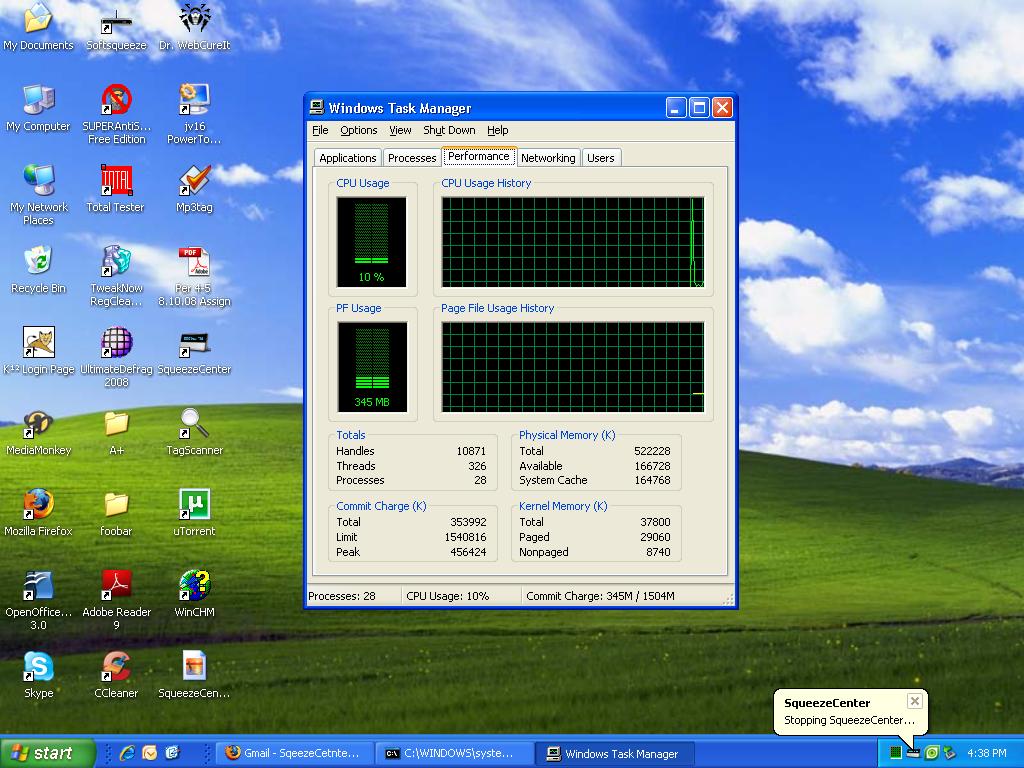 Problem: Squeezecenter has two issues when starting and stopping. The program takes and extremely long time to start, anywhere from 1-2 mins. Then, when it comes to right clicking on the icon and clicking to stop it, the program never responds and stops, it just keeps running no matter how many times it has been clicked to stop. System Specs: XP SP2 512MB Ram P4 2.2ghz Troubleshooting Steps: Performed clean install of SC 7.2.1 Made sure no Firewalls/Antivirus Please note attachments: Attached are the Log files and Event view and Task manager information. **Also note the icons/applications on the desktop in the screenshots that are provided**** Log file when starting SqueezeCenter: [08-10-30 08:05:53.9380] main::init (299) SqueezeCenter OS Specific init... [08-10-30 08:05:53.9431] main::init (342) SqueezeCenter settings effective user and group if requested... [08-10-30 08:05:53.9480] main::init (352) SqueezeCenter binary search path init... [08-10-30 08:05:53.9533] main::init (355) SqueezeCenter strings init... [08-10-30 08:05:54.1004] Slim::Utils::Strings::loadStrings (111) Retrieving string data from string cache: C:\Documents and Settings\All Users\Application Data\SqueezeCenter\Cache\strings.bin [08-10-30 08:05:54.1463] Slim::Utils::Strings::loadStrings (147) String cache contains old data - reparsing string files [08-10-30 08:05:54.1519] Slim::Utils::Strings::loadStrings (166) Loading string file: C:\Program Files\SqueezeCenter\server\strings.txt [08-10-30 08:05:55.2718] Slim::Utils::Strings::loadStrings (166) Loading string file: C:\Program Files\SqueezeCenter\server\Slim\Plugin\AudioScrobbler\strings.txt [08-10-30 08:05:55.3085] Slim::Utils::Strings::loadStrings (166) Loading string file: C:\Program Files\SqueezeCenter\server\Slim\Plugin\CLI\strings.txt [08-10-30 08:05:55.3253] Slim::Utils::Strings::loadStrings (166) Loading string file: C:\Program Files\SqueezeCenter\server\Slim\Plugin\DateTime\strings.txt [08-10-30 08:05:55.3455] Slim::Utils::Strings::loadStrings (166) Loading string file: C:\Program Files\SqueezeCenter\server\Slim\Plugin\DigitalInput\strings.txt [08-10-30 08:05:55.3539] Slim::Utils::Strings::loadStrings (166) Loading string file: C:\Program Files\SqueezeCenter\server\Slim\Plugin\Favorites\strings.txt [08-10-30 08:05:55.3725] Slim::Utils::Strings::loadStrings (166) Loading string file: C:\Program Files\SqueezeCenter\server\Slim\Plugin\Health\strings.txt [08-10-30 08:05:55.4227] Slim::Utils::Strings::loadStrings (166) Loading string file: C:\Program Files\SqueezeCenter\server\Slim\Plugin\InfoBrowser\strings.txt [08-10-30 08:05:55.4420] Slim::Utils::Strings::loadStrings (166) Loading string file: C:\Program Files\SqueezeCenter\server\Slim\Plugin\iTunes\strings.txt [08-10-30 08:05:55.4628] Slim::Utils::Strings::loadStrings (166) Loading string file: C:\Program Files\SqueezeCenter\server\Slim\Plugin\JiveExtras\strings.txt [08-10-30 08:05:55.4722] Slim::Utils::Strings::loadStrings (166) Loading string file: C:\Program Files\SqueezeCenter\server\Slim\Plugin\LastFM\strings.txt [08-10-30 08:05:55.4838] Slim::Utils::Strings::loadStrings (166) Loading string file: C:\Program Files\SqueezeCenter\server\Slim\Plugin\LineIn\strings.txt [08-10-30 08:05:55.5048] Slim::Utils::Strings::loadStrings (166) Loading string file: C:\Program Files\SqueezeCenter\server\Slim\Plugin\Live365\strings.txt [08-10-30 08:05:55.5122] Slim::Utils::Strings::loadStrings (166) Loading string file: C:\Program Files\SqueezeCenter\server\Slim\Plugin\LMA\strings.txt [08-10-30 08:05:55.5200] Slim::Utils::Strings::loadStrings (166) Loading string file: C:\Program Files\SqueezeCenter\server\Slim\Plugin\MP3tunes\strings.txt [08-10-30 08:05:55.5267] Slim::Utils::Strings::loadStrings (166) Loading string file: C:\Program Files\SqueezeCenter\server\Slim\Plugin\MusicMagic\strings.txt [08-10-30 08:05:55.5538] Slim::Utils::Strings::loadStrings (166) Loading string file: C:\Program Files\SqueezeCenter\server\Slim\Plugin\Pandora\strings.txt [08-10-30 08:05:55.5805] Slim::Utils::Strings::loadStrings (166) Loading string file: C:\Program Files\SqueezeCenter\server\Slim\Plugin\Picks\strings.txt [08-10-30 08:05:55.5870] Slim::Utils::Strings::loadStrings (166) Loading string file: C:\Program Files\SqueezeCenter\server\Slim\Plugin\Podcast\strings.txt [08-10-30 08:05:55.6029] Slim::Utils::Strings::loadStrings (166) Loading string file: C:\Program Files\SqueezeCenter\server\Slim\Plugin\PreventStandby\strings.txt [08-10-30 08:05:55.6100] Slim::Utils::Strings::loadStrings (166) Loading string file: C:\Program Files\SqueezeCenter\server\Slim\Plugin\RadioIO\strings.txt [08-10-30 08:05:55.6197] Slim::Utils::Strings::loadStrings (166) Loading string file: C:\Program Files\SqueezeCenter\server\Slim\Plugin\RadioTime\strings.txt [08-10-30 08:05:55.6307] Slim::Utils::Strings::loadStrings (166) Loading string file: C:\Program Files\SqueezeCenter\server\Slim\Plugin\RandomPlay\strings.txt [08-10-30 08:05:55.6540] Slim::Utils::Strings::loadStrings (166) Loading string file: C:\Program Files\SqueezeCenter\server\Slim\Plugin\Rescan\strings.txt [08-10-30 08:05:55.6685] Slim::Utils::Strings::loadStrings (166) Loading string file: C:\Program Files\SqueezeCenter\server\Slim\Plugin\RhapsodyDirect\strings.txt [08-10-30 08:05:55.6864] Slim::Utils::Strings::loadStrings (166) Loading string file: C:\Program Files\SqueezeCenter\server\Slim\Plugin\RS232\strings.txt [08-10-30 08:05:55.7012] Slim::Utils::Strings::loadStrings (166) Loading string file: C:\Program Files\SqueezeCenter\server\Slim\Plugin\RSSNews\strings.txt [08-10-30 08:05:55.7280] Slim::Utils::Strings::loadStrings (166) Loading string file: C:\Program Files\SqueezeCenter\server\Slim\Plugin\SavePlaylist\strings.txt [08-10-30 08:05:55.7474] Slim::Utils::Strings::loadStrings (166) Loading string file: C:\Program Files\SqueezeCenter\server\Slim\Plugin\ShoutcastBrowser\strings.txt [08-10-30 08:05:55.7557] Slim::Utils::Strings::loadStrings (166) Loading string file: C:\Program Files\SqueezeCent