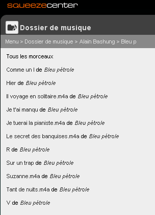 dj@server:~$ sudo ls -alR "/srv/iTunes/iTunes Music/Alain Bashung/" ... /srv/iTunes/iTunes Music/Alain Bashung/Bleu p?trole: total 331952 drwxr-xr-x 2 media media 4096 2008-05-10 21:08 . drwxr-xr-x 5 media media 4096 2008-05-10 21:04 .. -rw-r--r-- 1 media media 59689494 2008-05-10 21:07 Comme un l?go.m4a -rw-r--r-- 1 media media 30487986 2008-05-10 21:07 Hier ? Sousse.m4a -rw-r--r-- 1 media media 21909658 2008-05-10 21:07 Il voyage en solitaire.m4a -rw-r--r-- 1 media media 26697764 2008-05-10 21:07 Je t'ai manqu?.m4a -rw-r--r-- 1 media media 45213547 2008-05-10 21:07 Je tuerai la pianiste.m4a -rw-r--r-- 1 media media 24023752 2008-05-10 21:07 Le secret des banquises.m4a -rw-r--r-- 1 media media 23789498 2008-05-10 21:07 R?sidents de la r?publique.m4a -rw-r--r-- 1 media media 27858803 2008-05-10 21:07 Sur un trap?ze.m4a -rw-r--r-- 1 media media 24245969 2008-05-10 21:07 Suzanne.m4a -rw-r--r-- 1 media media 29972698 2008-05-10 21:07 Tant de nuits.m4a -rw-r--r-- 1 media media 25595588 2008-05-10 21:07 V?nus.m4a